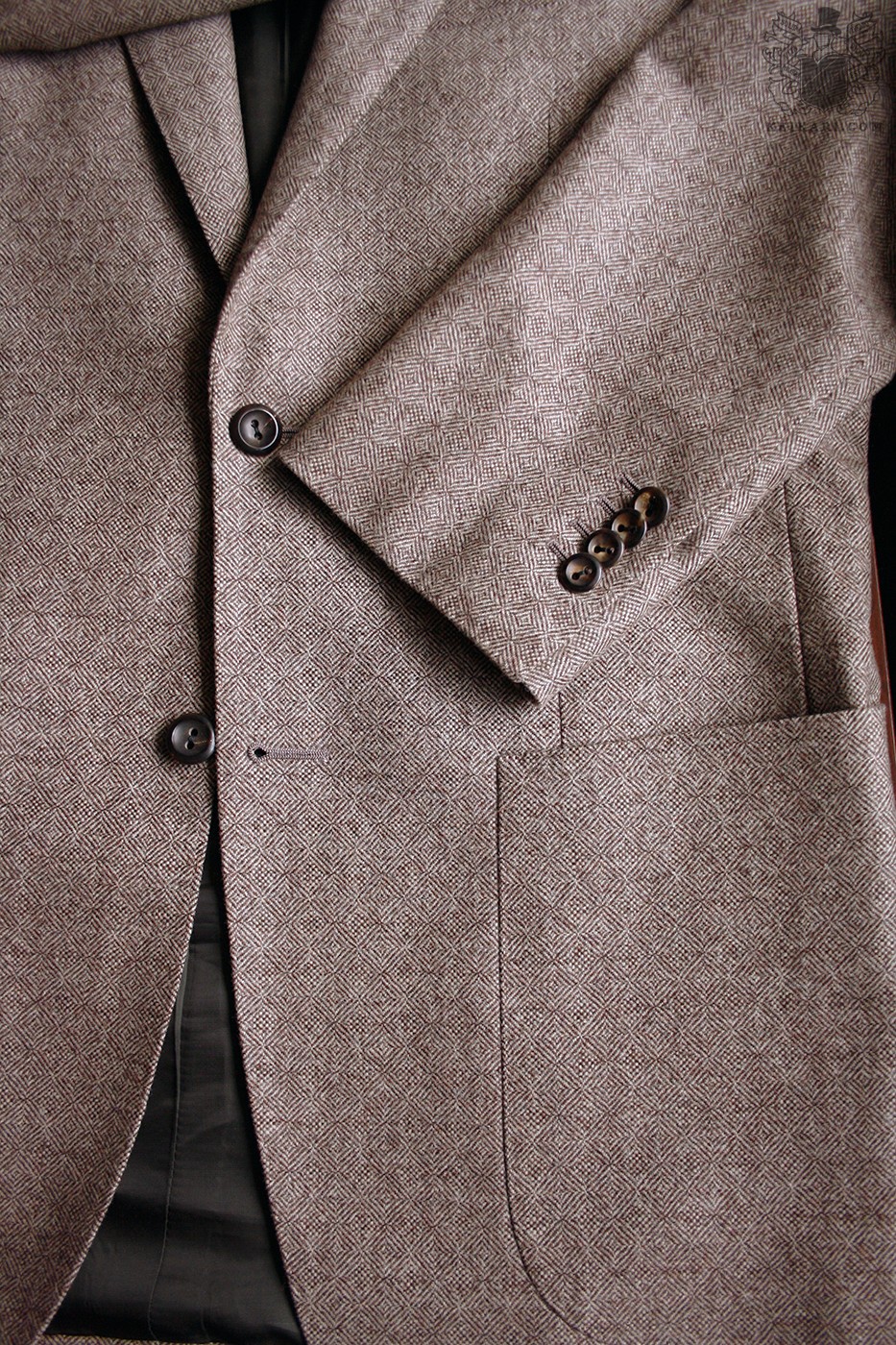 Arkipuvun esimerkkiä: kangas flanellia timanttikudoksella, kookkaat paikkataskut, rakenteettomat hartiat, housuissa ei laskoksia