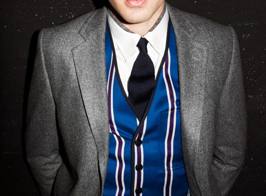 Päivän toisena yhdistelmänä harmaa flanellipuku, valkoinen kauluspaita, tummansininen solmio sekä kirkasta väriä tuova boating blazer -takin kankaasta valmistettu liivi.
