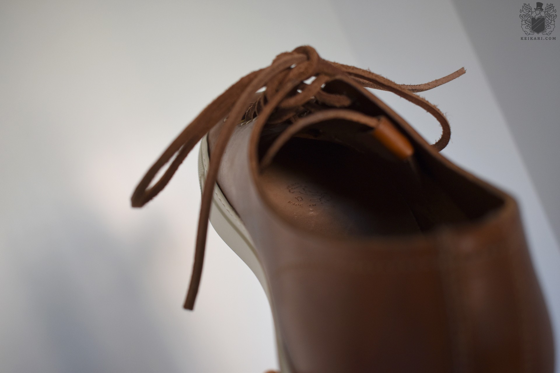 Erikoista kyllä, mallissa ei ole lainkaan vuorimateriaalia, vain ohut lisäkerros kengänsuun ympärillä. Näin Taninosta on kai tavoiteltu helpommin taipuvaa ja mukautuvaa. Kantakuppia kiertää nahkainen vahvike, kärjessä sellaista ei ole lainkaan. Nauhareiät ovat paksua messinkiä, joka on hieman kuluneen näköistä valmiiksi. Buttero suosii nahkaisia kengännauhoja, jotka toimivat mielestäni huonosti. Niistä irtoaa helposti nahkarouhetta, nauhoja on hankala kiristää ja niissä on reilusti pituutta. Mukana saapuu toki tavalliset nauhat valinnanvaraksi.