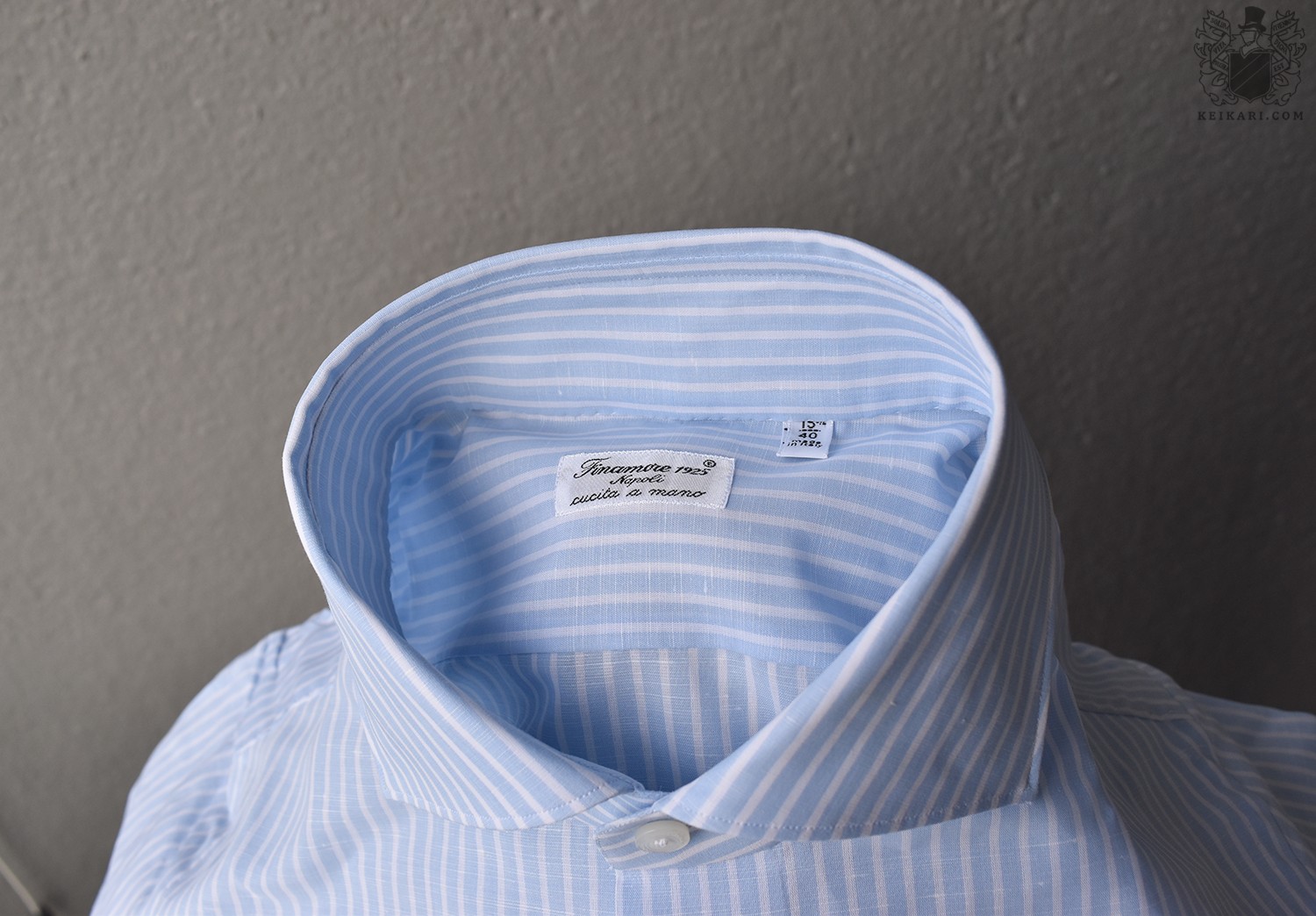 Finamore on yksi Italian vanhimmista kauluspaitoihin erikoistuneista tehtaista, jonka perusanti jakautuu kahtia. Edustuspaidat ovat pääosin valkoisia tai sinisiä, vapaa-ajan kauluspaidoissa vain mielikuvitus on rajana. Riippuen mallista, käsin ompelua on suurenmoisesti tai sitten hyvin vähän, joten on parempi tietää haluamansa etukäteen. Kaulusmallit ovat tuttua levitettyä eli cutaway-mallia tai sitten hieman terävämpiä eli point-mallia, kalvosimet ovat pääosin napitettuja, muodoltaan pyöristettyjä tai lovillisia. Paperilla kaikki on siis samanlaista kuin muilla Napolin paitamaakareilla, joten on hyvä selvittää, miten Finamore tahtoo erottua muista.