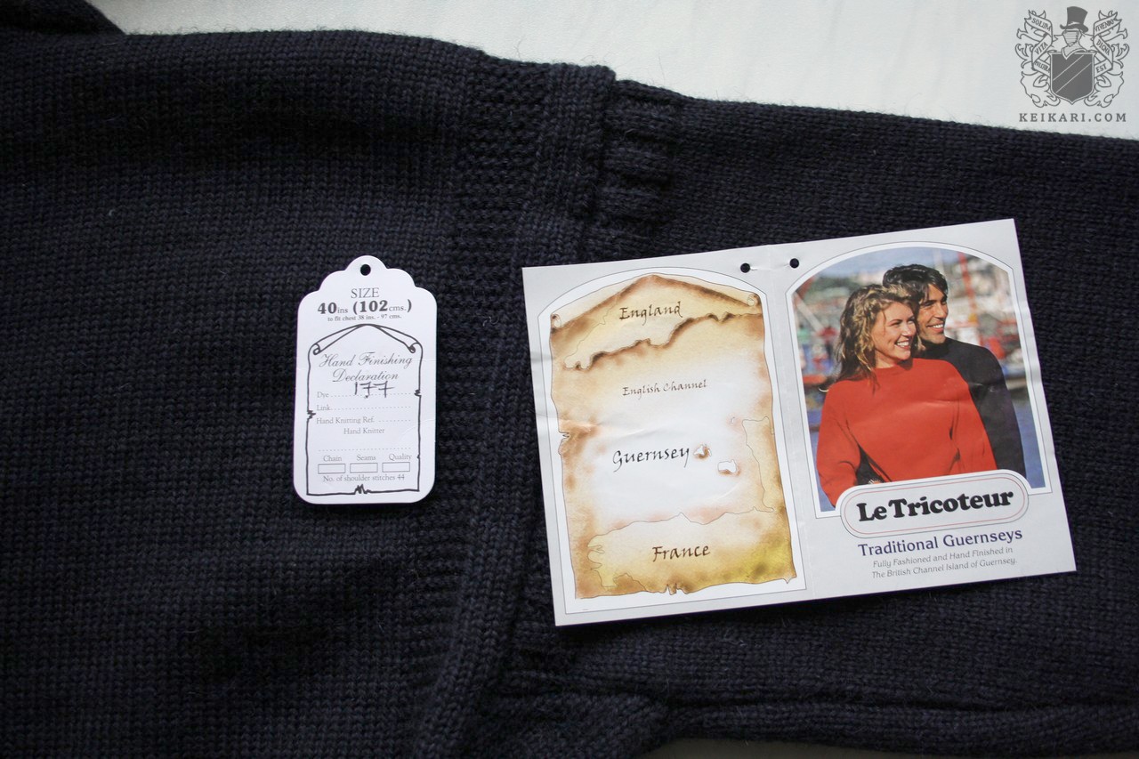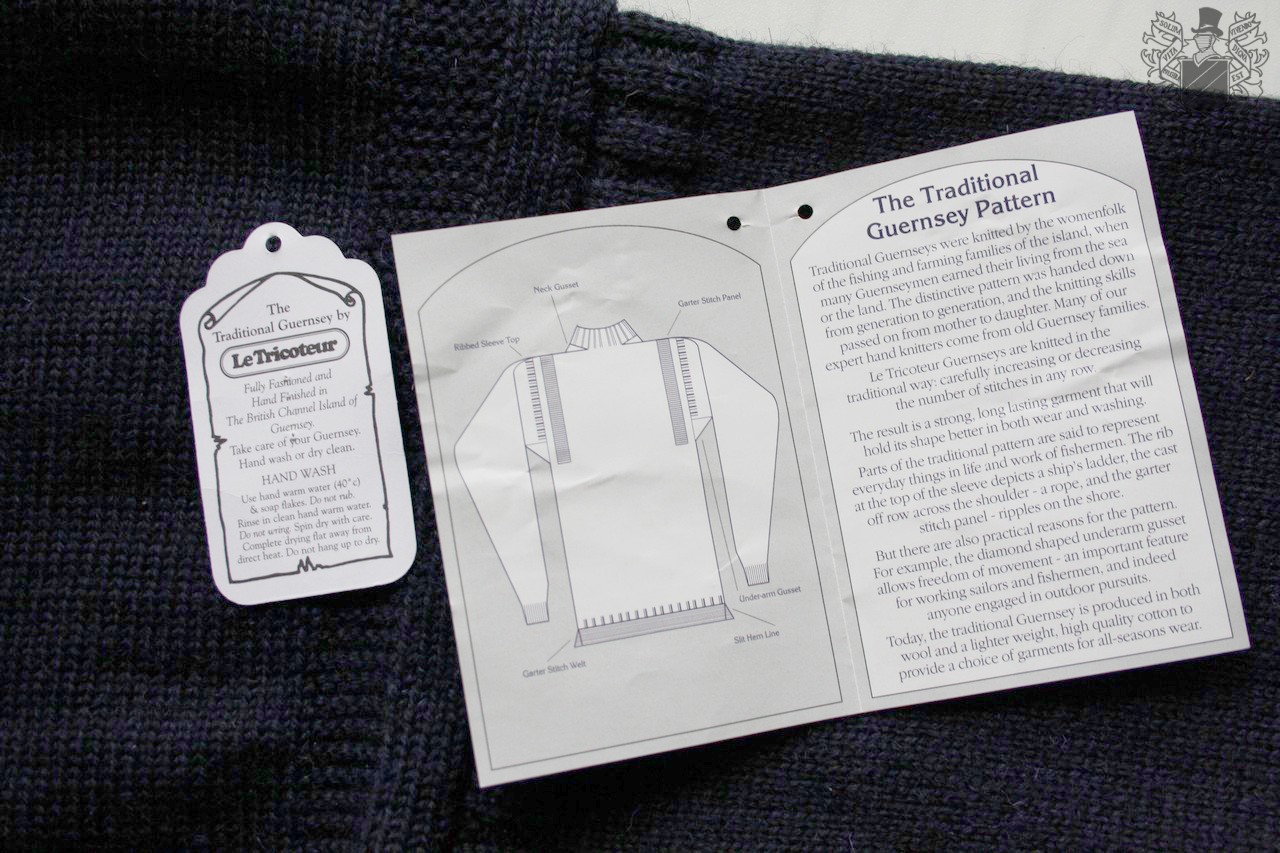 Tässä mallissa on monta yksityiskohtaa, jotka yhdessä tekevät siitä uniikin. Guernsey neulotaan yleensä viimeistelemättömästä englantilaisesta kampalankavillasta, josta lampaan lanoliinia eli villarasvaa ei ole poistettu. Neule siis tuoksuu enemmän tai vähemmän eläimelliseltä, mutta rasvan vuoksi myös hylkii vahvasti vettä. Guernseyt luodaan yleensä viidestä langasta, jotka kierretään vahvasti yhteen yhden paksun luomiseksi, ja tämän jälkeen malli neulotaan tiiviiksi. Miehusta on suora, hihat vahvasti ranteeseen kapenevat. Guernseyssä ei ole lainkaan etu- tai takapuolta, vaan neuletta voi pitää kummin päin tahansa. Tämä lisää käyttöikää, kun langat eivät kulu samoista kohdista vuosien kuluessa.