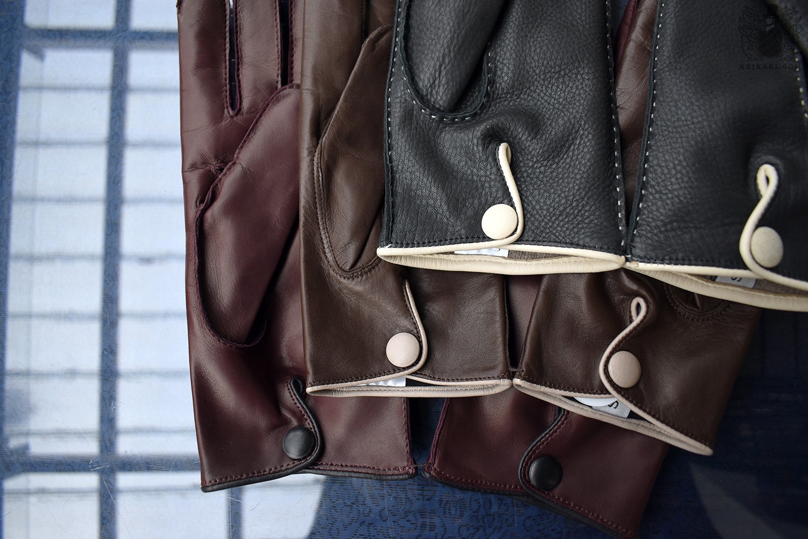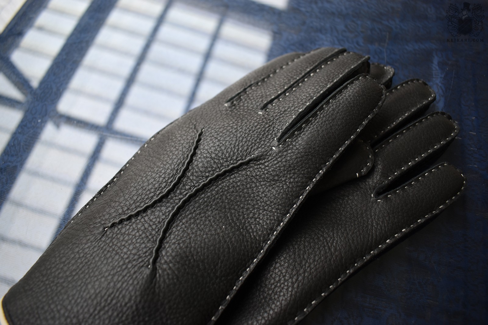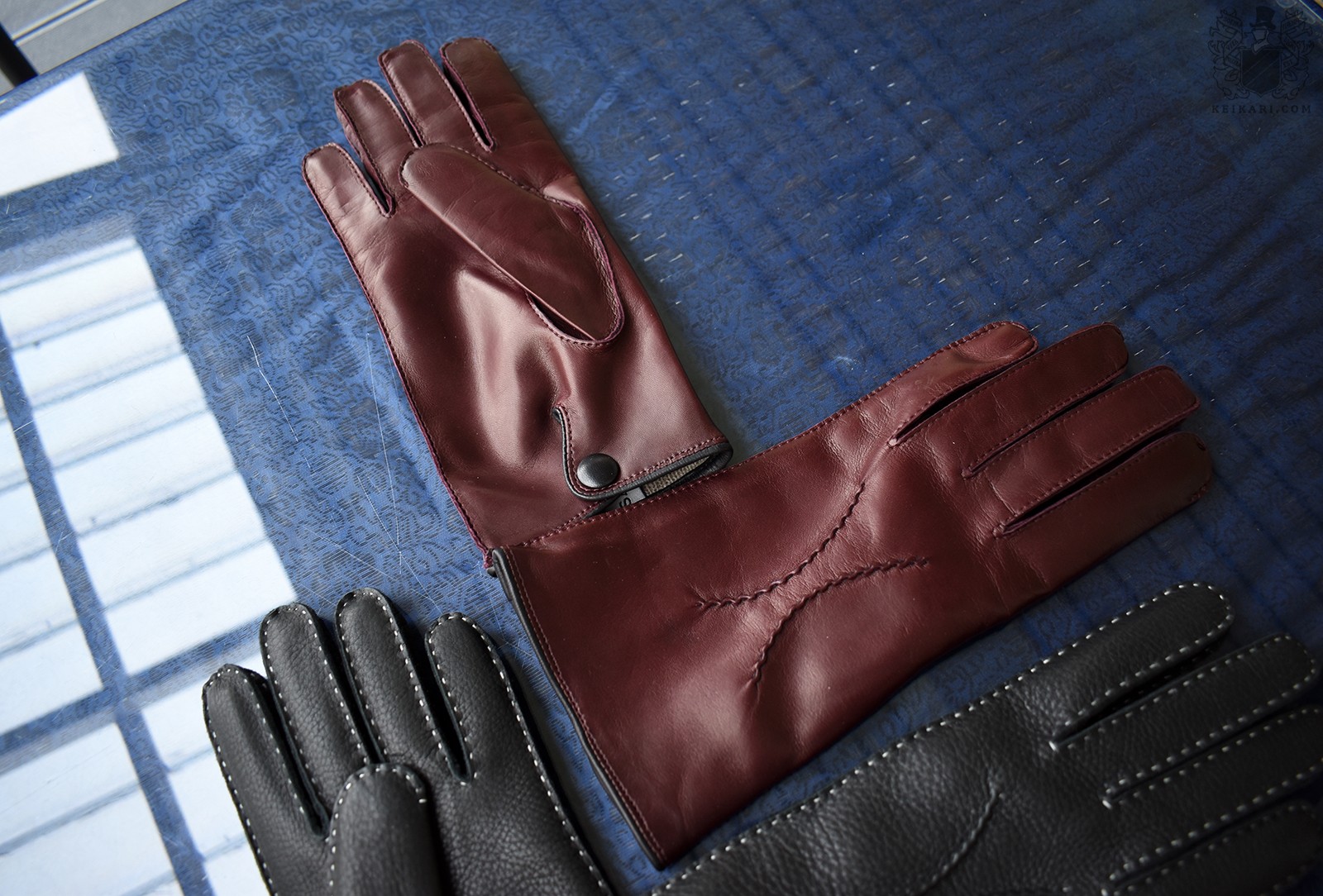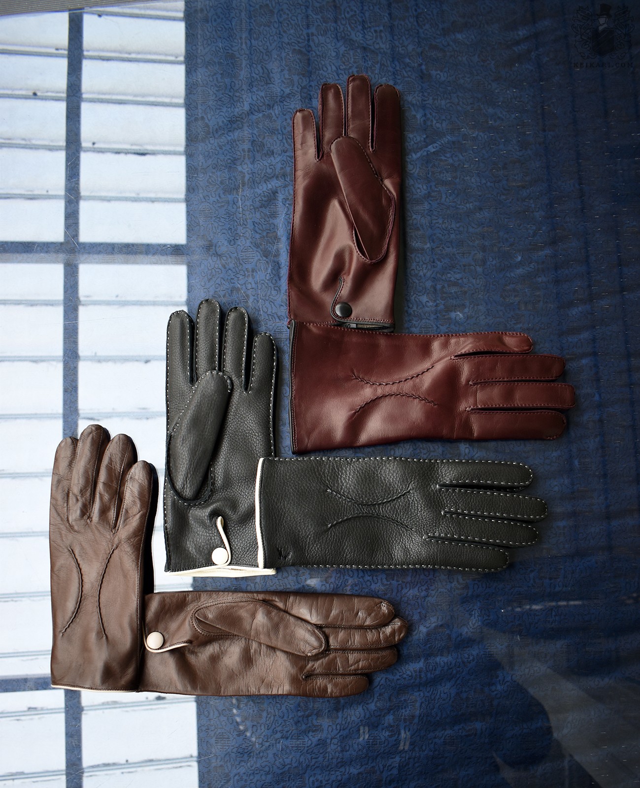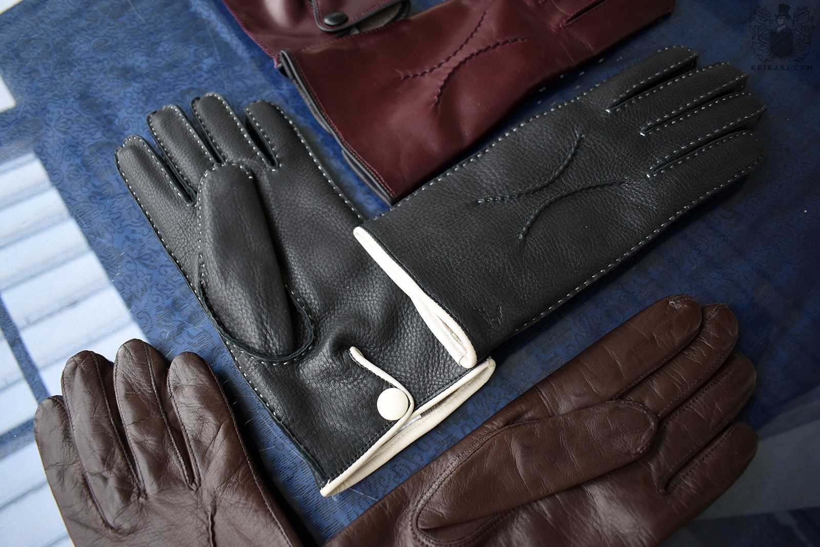 Uljas on suosikkini, koska sen materiaali on pehmeää, vahvaa ja kiinnostavan näköistä peuraa. Sen lisänä on Jalo, keskiruskea lampaan napppanahkasta ommeltu malli, sekä Urho, joka on tummanpunainen nappakäsine. Kaikissa on ranteen kohdalla nappi, joka sulkee käsineen tehokkaasti. Näin viima ei pääse sisään yhtä helposti – ja onhan nappi myös hieno koriste. Lisäksi käsineissä on päänahkan väriä vaaleampi nahkatere reunassa. Se tuo komiaa kontrastia. Uljas on suunniteltu mustien jalkineiden pariksi, mutta valkoinen kontrastiväri estää niitä muuttumasta tylsiksi, kuten mustat käsineet yleensä ovat. Jalo on keskiruskea eli se passaa kaikkien ruskeiden popojen pariksi. Urho on tummanpunainen, koska tuo väri on reunoskengissä melko yleinen, mutta sen pariksi sopivia käsineitä on hyvin vaikea löytää.