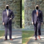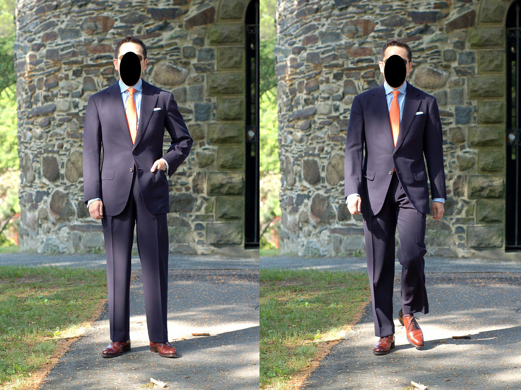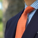 Sopivan kesäistä ja rennon sekä virallisen kesken tasapainoilevaa: tummansininen italialainen tilauspuku, raitakauluspaita, oranssi solmio, valkoinen taskuliina ja ruskeat plain toe -jalkineet.