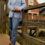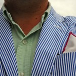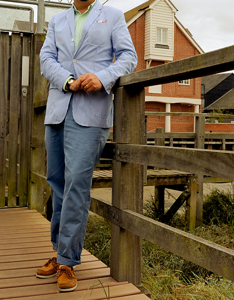 Koska syyskuu on yhä kummallisen lämmin, yksi kesäinen kokoonpano on vielä ajankohtainen. Esimerkkiä tarjoilee kuvan herrasmies: valko-siniraidallinen popliinitakki, vaaleanvihreä oxford-kankainen nappikauluspaita, punareunainen valkoinen taskuliina, siniset puuvillahousut, purjehduskengät – ilman sukkia.