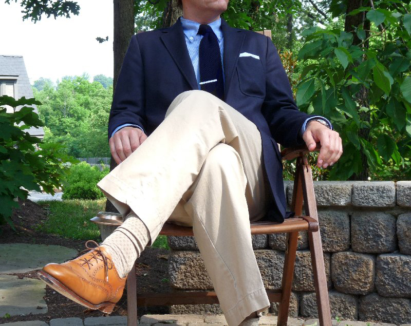 Kastanjanväriset brogue-jalkineet, vaaleat kuvioidut sukat, hiekanväriset housut, tummansininen klubitakki, button down -paita ja tummansininen kudottu solmio. Helppoa, melko formaalia ja silti rentoa.