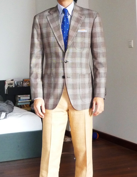 Hmm…takki on hieman isohko. Olkapäät roikkuvat hitusen (ks. vasen olkapää – n. 2-3cm lähemmäs niskaa siirrettynä olkasauma olisi kohdallaan), takin pituus on reilu (siinäkin pari senttiä tekisi ihmeitä) ja hihat ovat – kumpikin – hitusen liian pitkiä. Myös housujen väljyys antaa 80-lukumaista tuntua. Värit ovat sinällään hyvät, mutta saattaisivat hieman muunnettuina toimia paremmin. Taskuliina on niinikään hauska, mutta ehkä hieman liian kulmikkaasti asetettu.