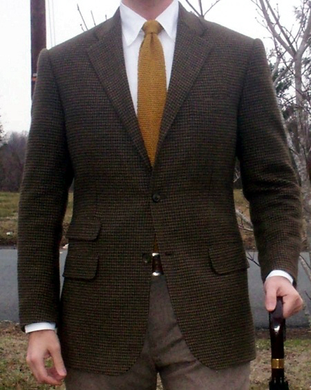 Tummanruskea kukonaskelkuvioinen irtotakki, valkoinen nappikauluspaita, sinapinvärinen villasolmio, ruskea vyö ja maantien väriset housut luovat yhdessä erinomaisen yhdistelmän syksyyn. Kaikki näkyvimmät vaatteet ovat tummahkoissa maan väreissä, ja taustatukea tarjoaa tummanpirteä solmio. Jalkineiksi voisi kuvitella vaikkapa Chukka-saappaat hyvin tummanruskeina. Ainoa kohennuksen kohde osuu rintakehään, jonka reunustaa taskuliina ei korista.