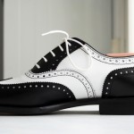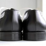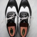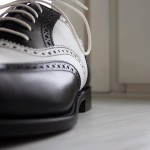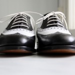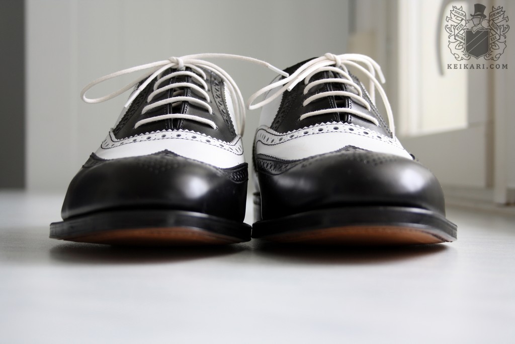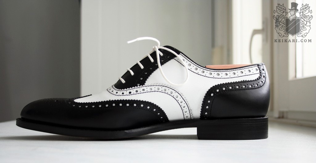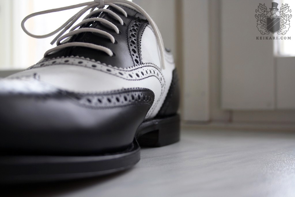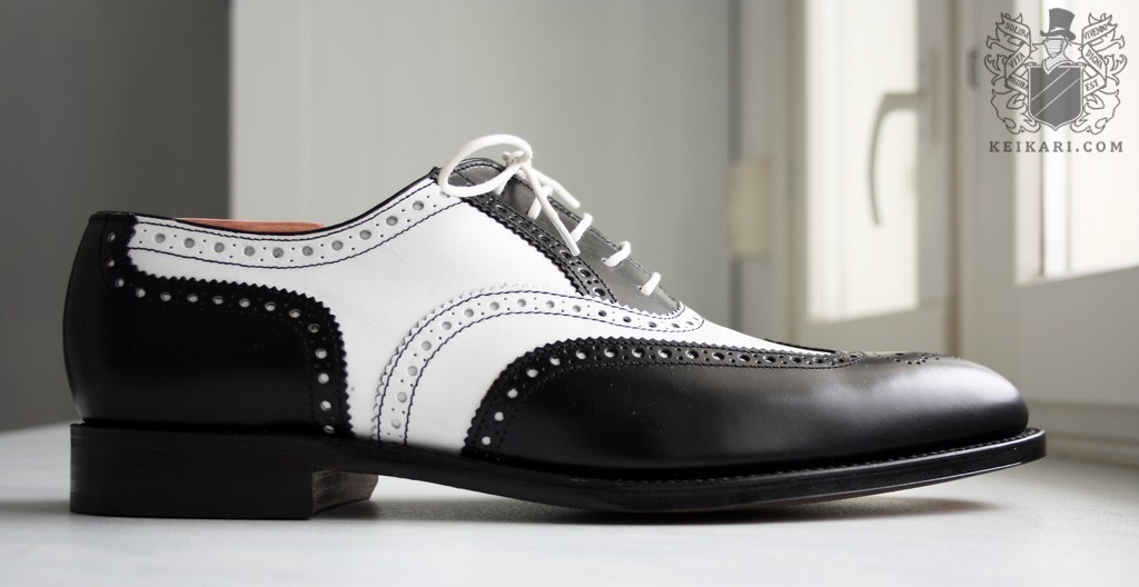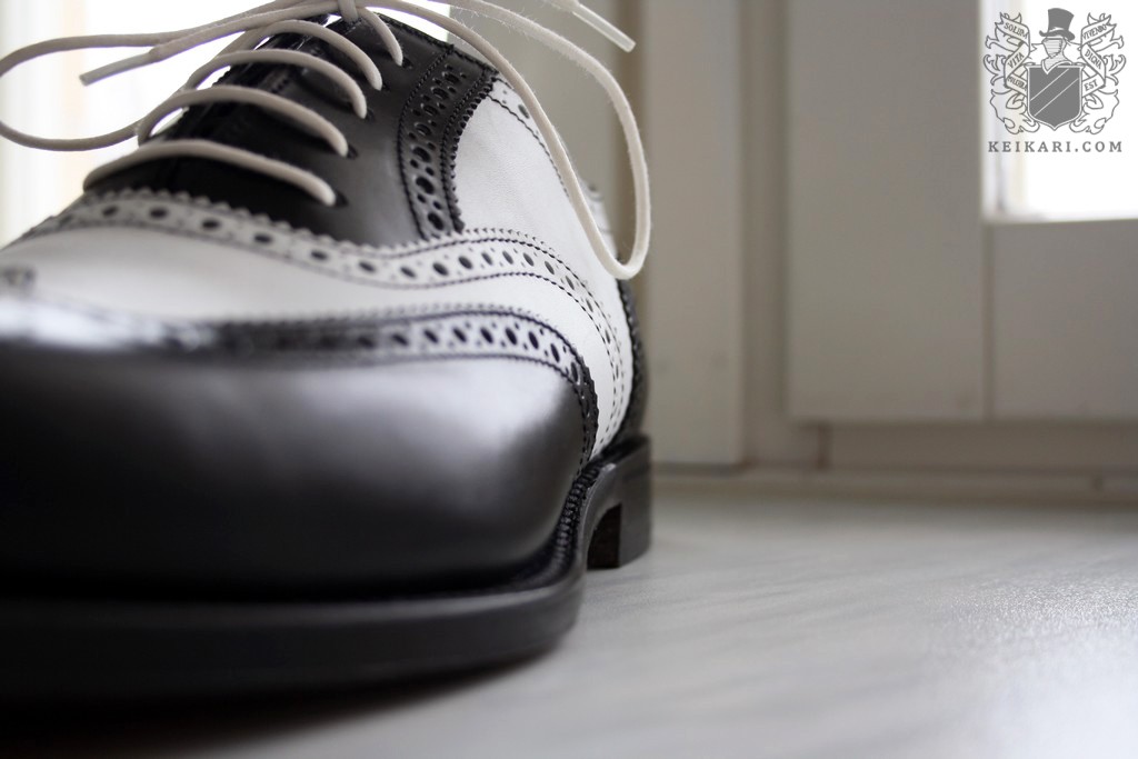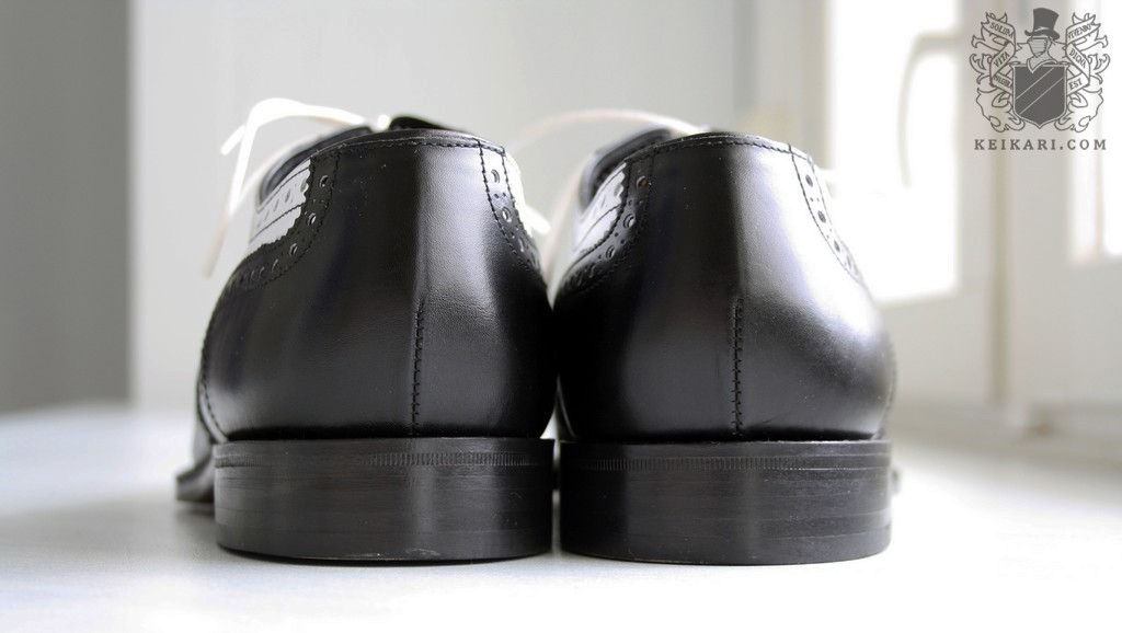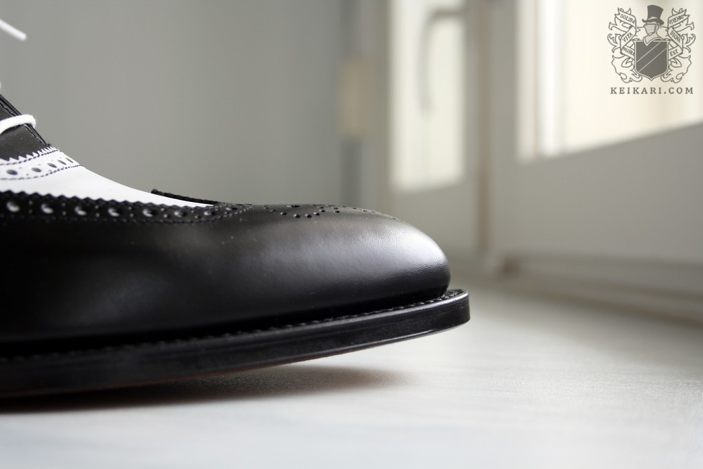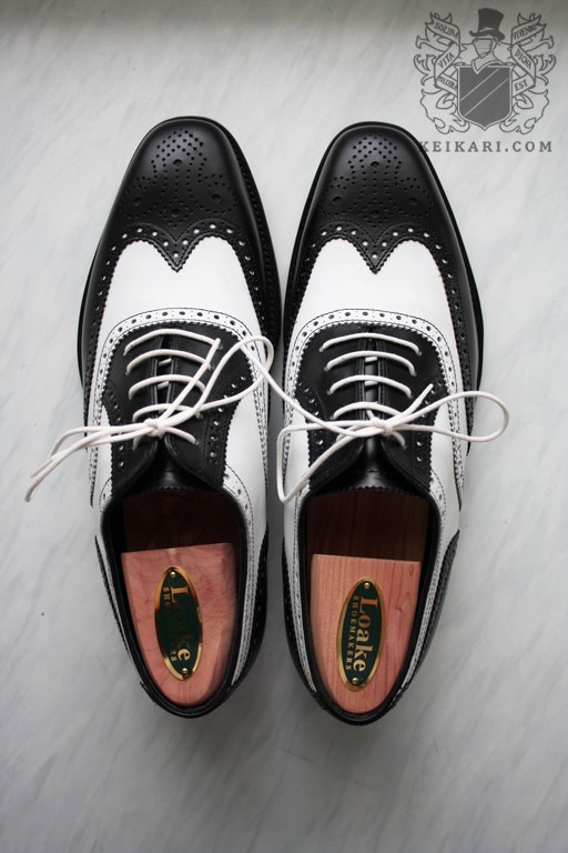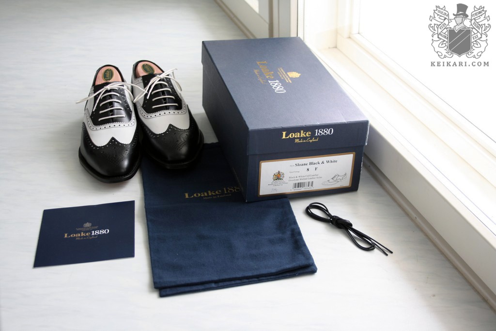 Esimerkkiparina toimii Loaken malli Sloane, perinteinen musta-valkoinen kesäajan spectator-jalkine valmistajan tasokkaimmasta 1880-mallistosta. Kuten toivoa sopii, pari on kauttaaltaan nahkaa. Päällinen on melko voimakkaan tuoksuista vasikkaa, kantakuppi ja kärki sopivasti tuettuja. Lesti on mainion tyköistuva ja muotoiltu, kärki on hieman kaartuva ja pyöreä, reunosommel siisti. Pari aiheuttaa harmia sikäli, kun päällisen ommel on melko epäsiisti. Brogue-koristeet on isketty melkoisella kiireellä, joten osa rei’istä on jäänyt epätasaisiksi ja erityisesti kärjen medaljongin kohdalla tämä on suuri sääli. Sisäpohja vaikuttaa kovin heppoiselta ja liimaa tursuaa jonkin verran eri nahkakappaleiden välistä. Käytännössä nämä kosmeettiset virheet eivät näy satunnaiselle katsojalle asti, mutta tarkinta pukeutujaa ne taatusti harmittavat. Loaken oman sarjan lepolestit eivät ole kovin tarkasti muotoiltuja, mutta tuoksuvat miellyttävästi setripuulta ja istuvat pariin erinomaisesti.