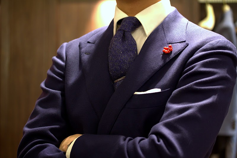 Päivän pukeutuja kulkee persoonallisella polulla. Tummansinisen puvun pariksi hän on valinnut säntillisesti kermanvaalean paidan, valkoisen taskuliinan ja kashmirsolmion, mutta napinläpeen kiskaissut pienen nipun marjoja.