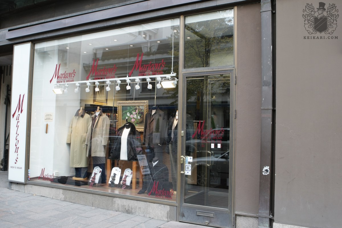 Akateemisen kirjakaupan ja ravintola Teatterin sulassa seurassa nököttää Marleon’s. Hillityn julkisivun sisälle kätkeytyy liuta maailman parhaiden valmistajien vaatteita ja asusteita. Tumma puu, parketti, taulut ja kirkkaat värit tervehtivät sisään astuvaa. Pittoreskin kodikas tunnelma vallitsee ja myyjällä on taatusti aikaa palvella asiakastaan. Pukuja, paitoja sekä solmioita löytyy reiluissa riveissä. Sormituntumaa täytyi saada.