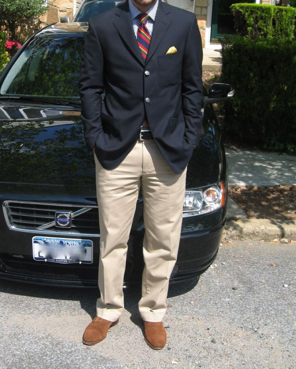 Mokkanahkaiset jalkineet ovat ideaalit kevään ja kesän kuiviin päiviin, jolloin herkkä materiaali ei todennäköisesti asetu alttiiksi kosteudelle. Kuvan herrasmies tarjoaa seuraavaa: tummansininen klubitakki, siniraitainen paita, värikäs rykmenttisolmio, pastellinkeltainen taskuliina, musta vyö, vaaleat puuvillahousut ja ilahduttavan sävyiset mokkakengät. Vain vyö on väärää kastia kaiken muun rinnalla, muutoin esimerkillistä.