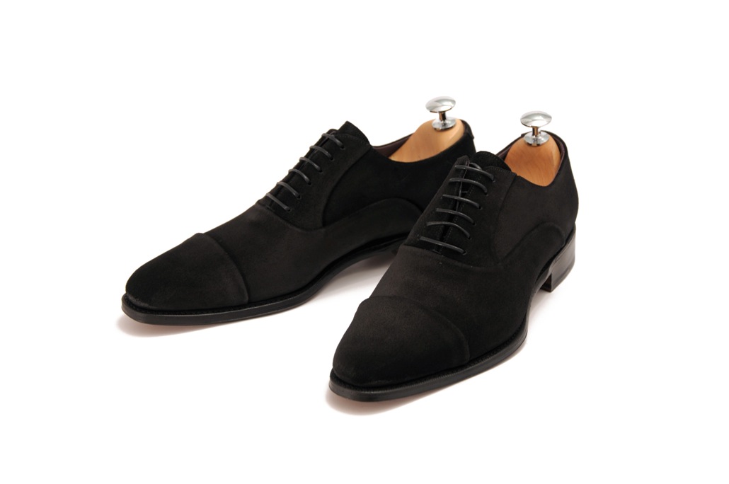 Ohessa pieni makupala espanjalaisen Meerminin tehtaalta. Jätin erikoistilauksen mustasta mokkanahkaisesta oxford-parista tammikuussa, kun huomasin ettei yksikään riittävän tasokas jalkinevalmistaja tarjoa sellaista mallistoissaan. Tavanomainen musta vasikannahkahan on peruskauraa oxford-rintamalla, mutta mokkainen versio tarjoaa kiehtovaa mattapintaista kontrastia mille tahansa kankaalle. Tätä mallia suosi erityisesti aikansa tarkka pukeutuja Cary Grant.