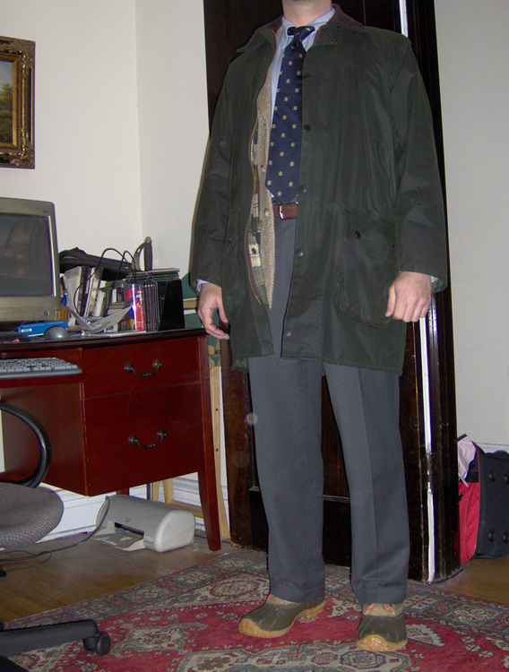 sanoopa roetzel kirjassaan mitä tahansa barbourin ‘all round’ -sopivuudesta, mielestäni öljykangastakki ja prässihousut saatikka puku näyttävät varsin typeriltä yhdessä. vähän niinkuin väyrynen eduskunnassa 80-luvulla puku ja lenkkarit -kombinaatiossa.