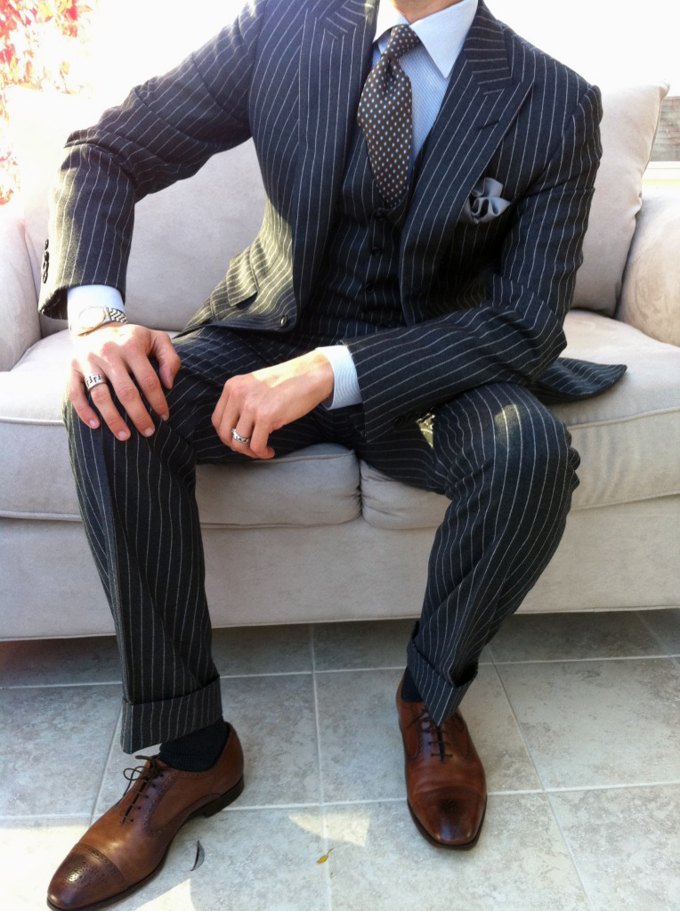 En ole kahlannut läpi tämän aikakauden kuvastoja, mutta kovin 40-luvun hengessä on tämä toimiva yhdistelmä liikkeellä. Tummansininen flanellipuku melko paksuilla kalkkiraidoilla, leveät pystykaulukset, mustat oxfordit, kapearaitainen kauluspaita, geometrinen taskuliina ja harmaa villasolmio.