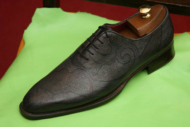 Päivän tilauspari: wholecut suipolla varpaalla ja hyvin kapealla reunoksella sekä viininpunaisella nahkavuorella. Poikkevan ulkonäön tuo nahkan pinnalla tulostettu tai painettu paisley-kuvio, joka useimmiten nähdään vain taskuliinoissa sekä solmioissa. Aikamoista.