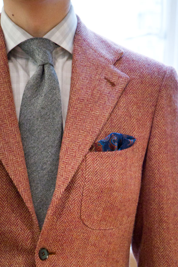 …ja päivän toinen verraton kokonaisuus: punasävyinen kalanruototakki, harmaa gingham-kuvioinen kauluspaita, harmaa kashmirsolmio ja sinipohjainen paisley-kuvioinen taskuliina.