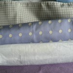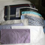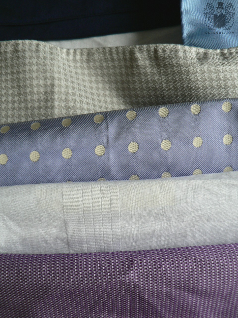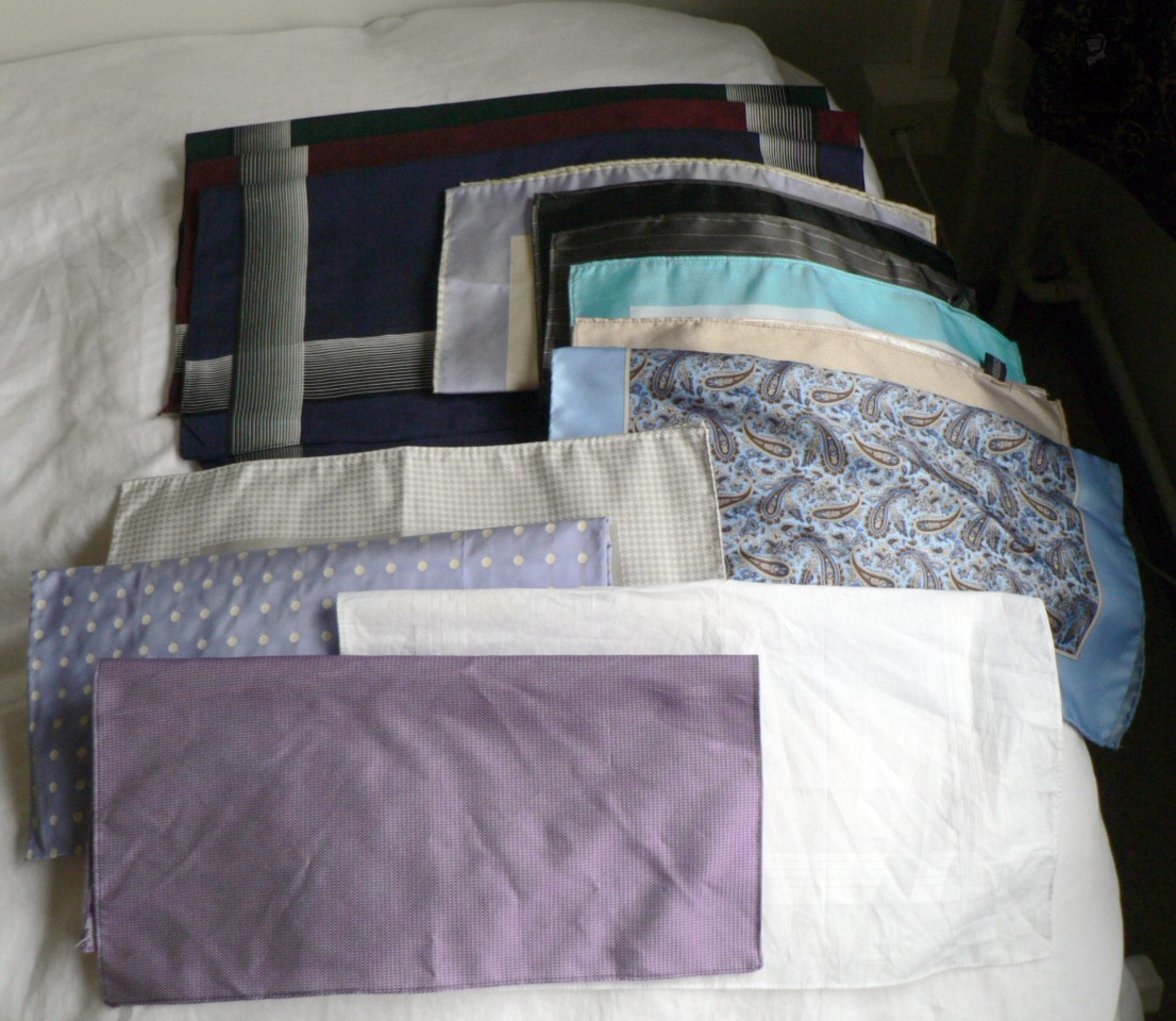 Alla pieniä esimerkkejä taskuliinojen valtavasta maailmasta, mukana yksi lila kappale, jossa reunat on rullattu ja ommeltu kauniisti käsityönä.
