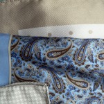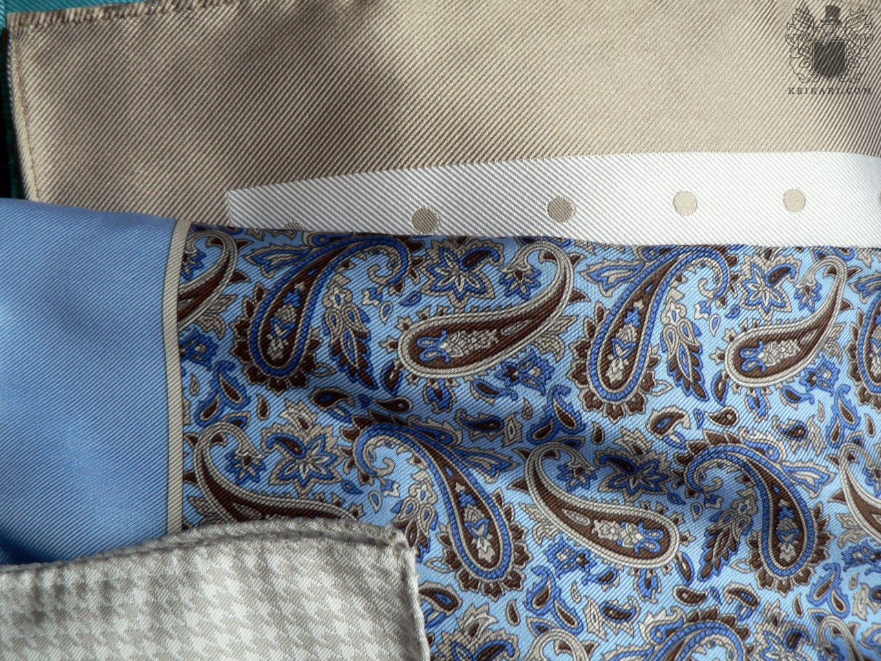 Olen menossa kesähäihin ja puvun väriksi valitsin tumman harmaan. Kauluspaidan väriksi ajattelin valita perinteisen valkoisen ja kravatin väriksi vaaleansinisen. Mutta nyt ongelmana onkin tuo pirun taskuliina. Voisiko se siis olla sininen, mutta eri kuviolla kuin kravatti?