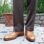 Tarkan maun pukeutuja ei näe rohkeasti kuvioidussa takissa ongelmaa, vaan pienimuotoisen haasteen joka vaatii oikeat yhdistelmät toimiakseen. Kuvan herrasmies luovii tiensä eleganssin puolelle: beige-sini-ruskea irtotakki, ruskeat irtohousut, vaaleanruskeat brogue-jalkineet, sininen nappikauluspaita, vihreä villasolmio, vaaleanruskea vyö, paisley-kuvioinen taskuliina.