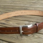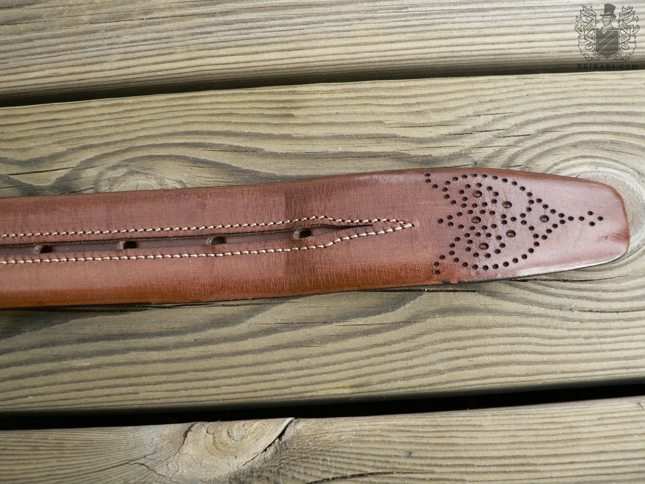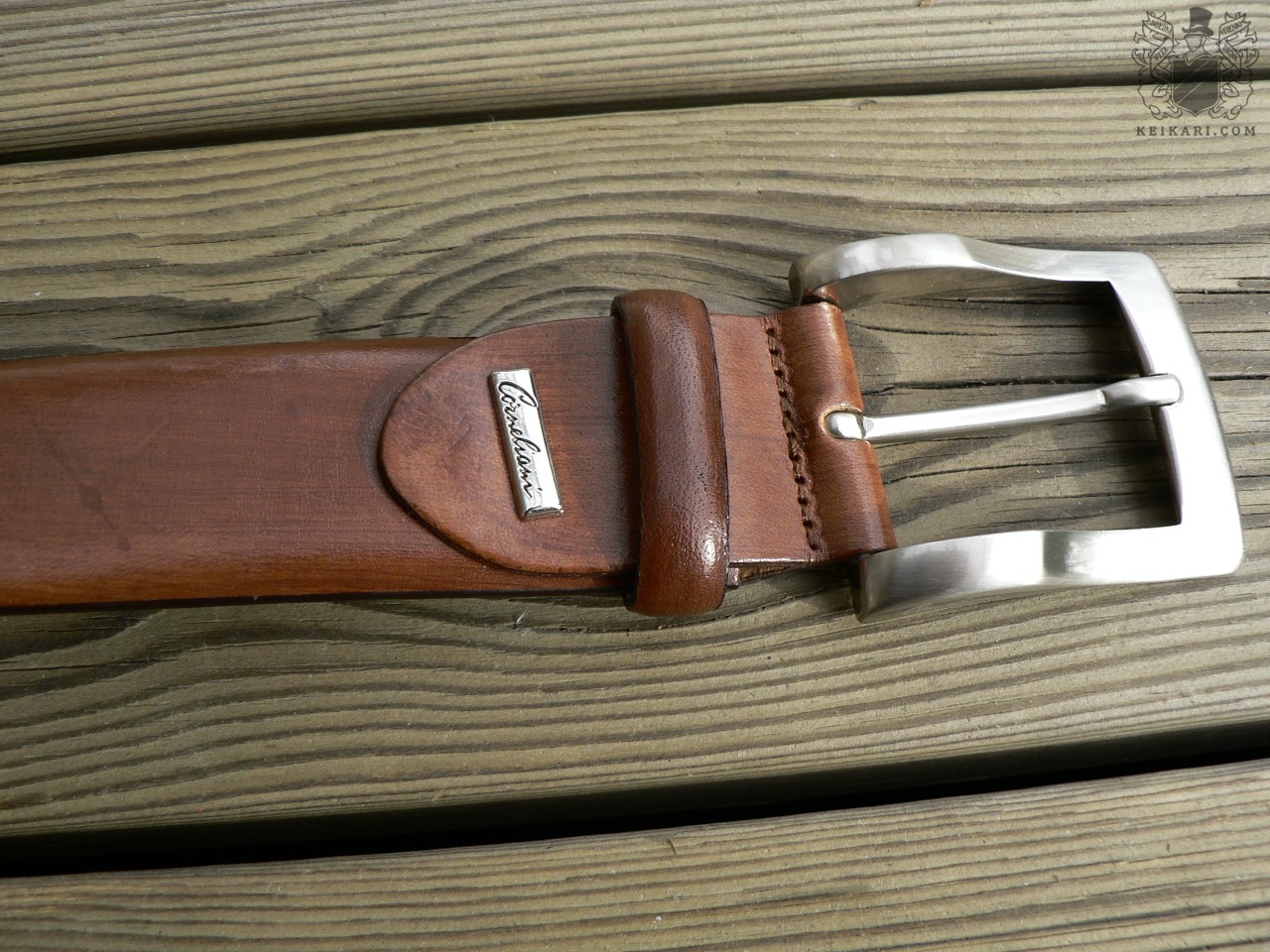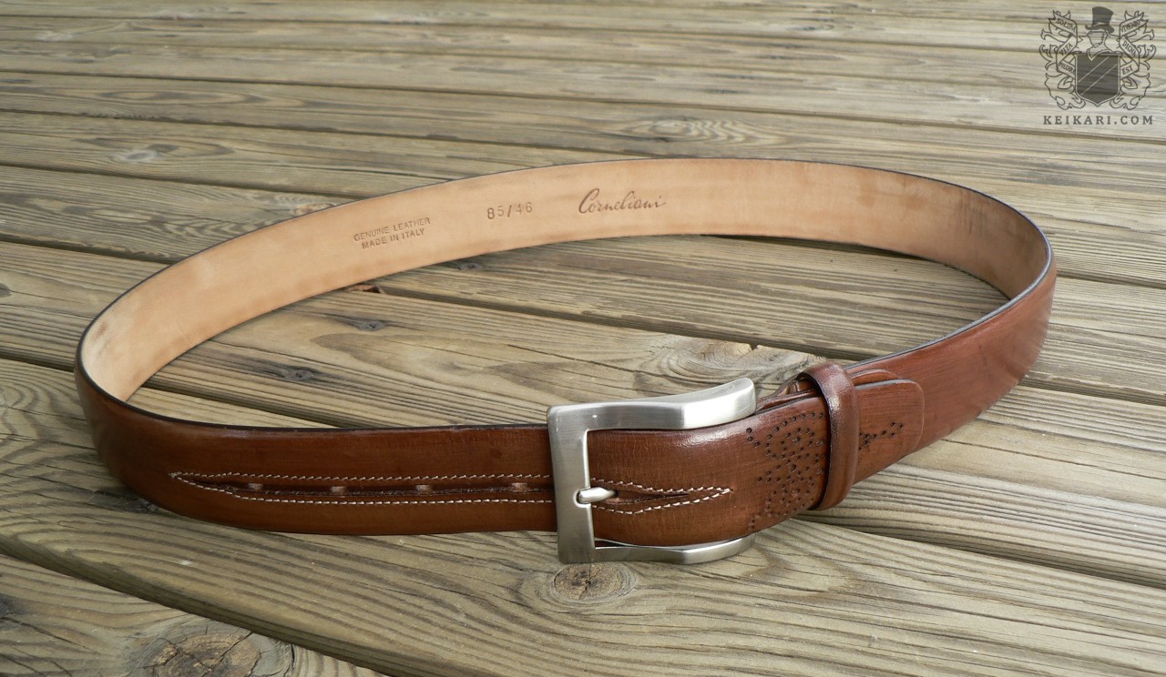 Esimerkkikuvassa perinteikäs italialainen Corneliani osoittaa suvereeniutta, jonka kaltaista en ole koskaan ruskeiden pukuvöiden rintamalla kohdannut. Nahkan väri on melko vaalea, käsintehty solki on täyttä messinkiä, reiät kehystetty vaalein ompelein. Suurin eleganssi kuitenkin syntyy brogue-koristelusta, joka muodostaa kauniin kuvion soljen seuraksi. Lopputulos on la dolce vitaa parhaimmillaan.