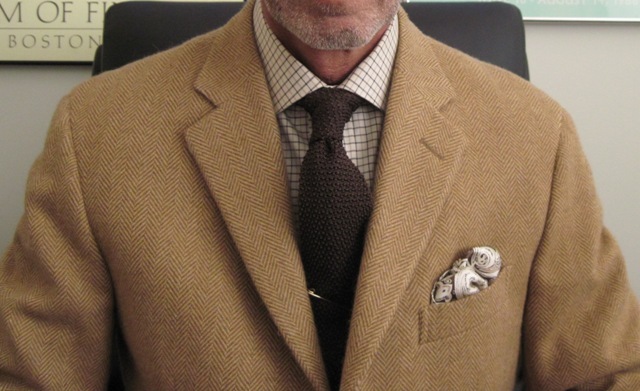 Päivän toimiva kokoonpano: vaaleanruskea kalanruotokuvioinen tweed-takki pehmeillä harteilla, karkea ja ruskea neulesolmio, solmiohaka, ruudukkopaita ja silkkinen paisley-taskuliina. Värisävyt on valittu ruskeasta paletista ja mukana on sopiva sekoitus tummaa sekä vaaleaa.