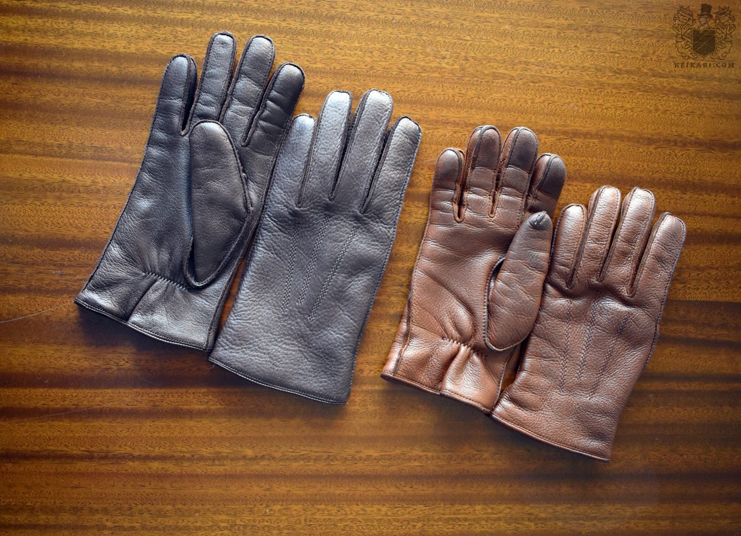 Oikealla 10 vuotta vanhat hirvennahkakäsineet, vasemmalla uusi pari