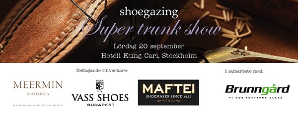 Shoegazing on Ruotsin suosituin miesten laatujalkinesivusto. Syyskuun 20. päivä blogööri Jesper Ingevaldsson järjestää myyntinäyttelyn Tukholmassa, jonne saapuu Unkarin maineikas Vass, Espanjan hinta-laatuihme Meermin ja Romaniassa tilaukset valmistava Maftei. Näin kaikki hintaluokat ovat edustettuna, samoin kuin teolliset ja täysin käsintehdyt parit, valmiskengät, erikoistilaukset, mittatilaukset ja kokoelman kruununa niin sanotut bespoke- eli tilausjalkineet.