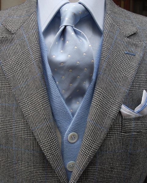 Perinteinen Prince of Wales -kuvioinen irtotakki on saanut parikseen vaaleansinisen neuletakin, vaaleansinisen paidan ja pallokuvioisen vaaleansinisen solmion. Myös valkoisen taskuliinan reunasta löytyy vaaleansinistä samoin kuin irtotakin napinreiästä. Kokonaisuudessa on liikaa yhtä väriä, mutta se on silti onnistuneen rajamailla. Esimerkiksi neuletakkia vaihtamalla kuva olisi ilahduttavan esimerkillinen.
