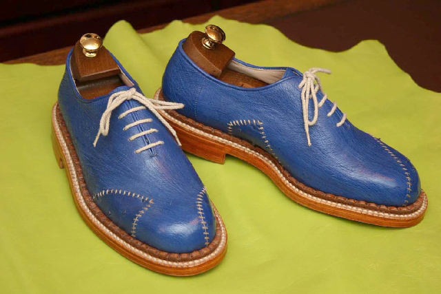 Päivän tilauspari olkoon esillä pelkkänä kuriositeettina suutarimestareiden taidosta ja hieman eksyneiden asiakkaiden villistä mielikuvituksesta. Sinistä strutsinnahkaa, Frankensteinmaiset irtopalaompeleet, hyvin paksu rypytetty 360:n asteen myrskyreunos, tuplanahkapohjat. Sanat eivät riitä kuvaamaan.