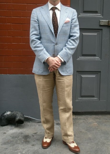 Kesän kuningasjalkineet, spectatorit, ovat aina paikalla pellavan kera. Tällä kertaa nämä kuninkaalliset ovat saaneet seurakseen vaaleat pellavahousut, vaaleansinisen pellavatakin, valkoisen kauluspaidan, pinkin taskuliinan sekä ruskean solmion. Mittasuhteet sekä istuvuus ovat mallillaan.