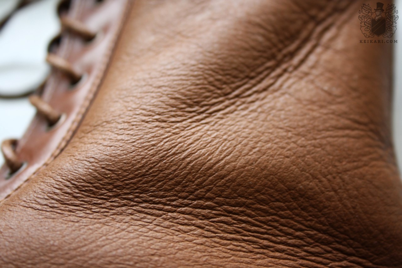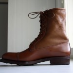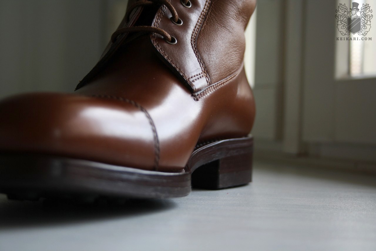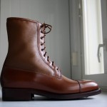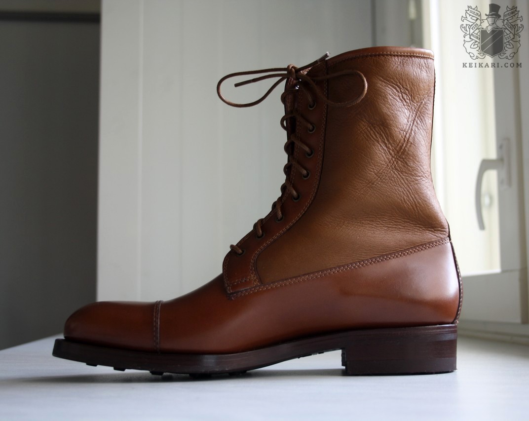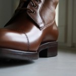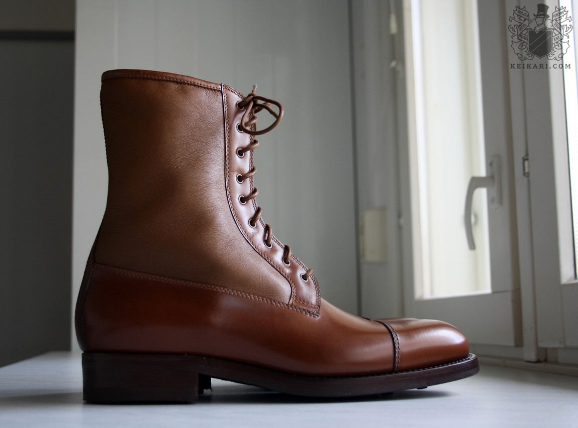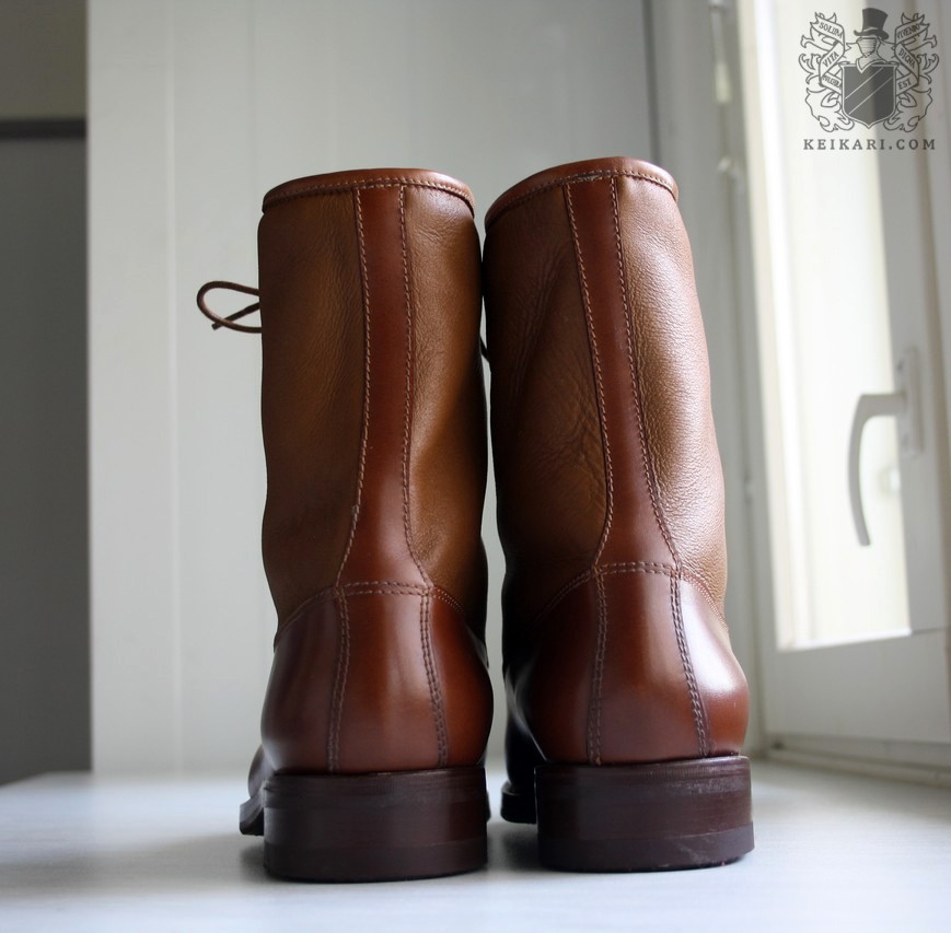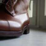 Esimerkkiparina tavallista pidemmin varsin luodut talvipukusaappaat, joissa on kelsiturkkinen vuori. Blake/Rapid-rakenne takaa kestävyyden, dainite-pohja jonkinlaisen pidon ja poikkeava vuori puolestaan lämmön. Lesti on luonnossa yhä sirompi kuin kuvissa, joten mukavan lämpimät suorat flanellihousut löytävät talvella uudet kumppanit. Enpä aluksi ollut uskoa Italian valmistajien tehtailevan moisia pareja, mutta poikkeukset ovat aina piriste.