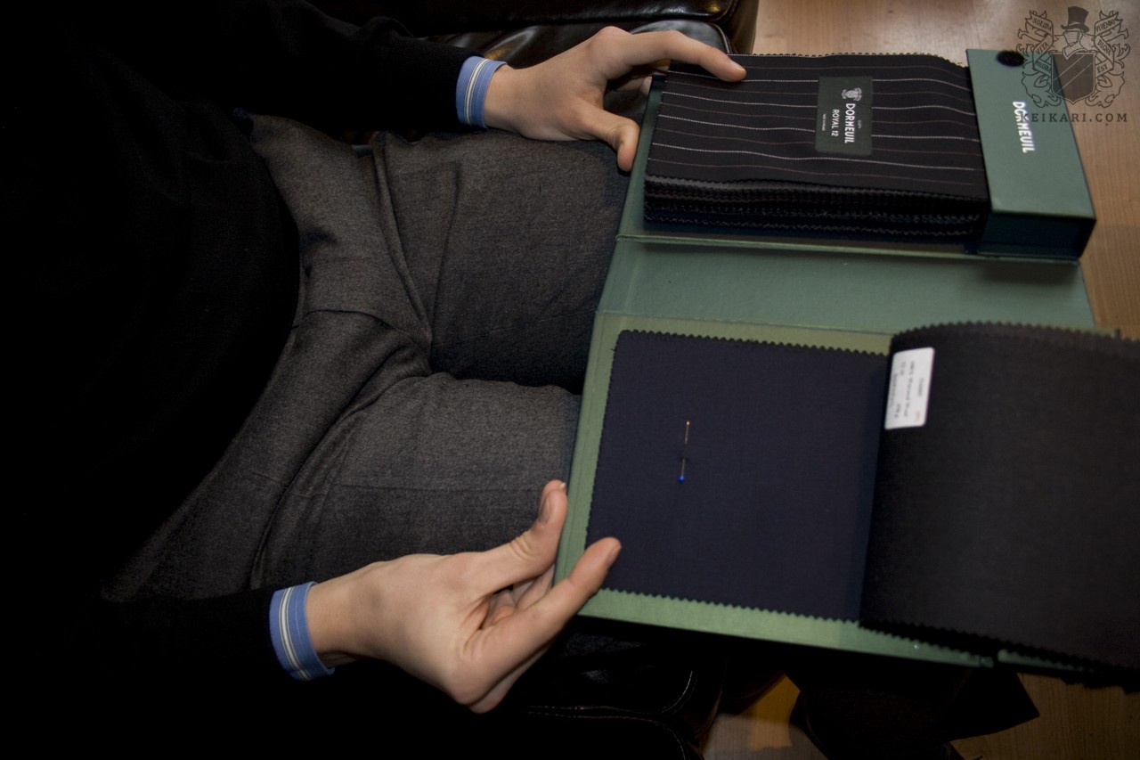 Bespoke- eli tilauspuvusta tulee kolmiosainen, pystykäänteinen ja kaksinappinen. Kangas on 370-grammaista englantilaista kampalankavillaa Dormeuilin mallistosta Royal 12, numeroltaan 98, väri äärimmäisen tumma sininen. Napit sarvea, kaikki napinreiät käsin ommeltuina. Ihastuin Charles Tyrwhittin yhteen liivimalliin, jonka mukainen tämän projektin liiveistä tulee. Pyöristettyä liivien alaosaa harvemmin näkee, ja juuri tällaisten yksityiskohtien kautta aion kauneuden ihannetta jahdata. Luonnollisesti myös liivien selkämys tulee olemaan villaa ja vasemman puoleiseen liivitaskuun tulee vahvempi tukikangas taskukellon vuoksi. Liivit leikataan Savile Row -tyyliin siten, ettei alinta nappia voi saada kiinnitettyä.