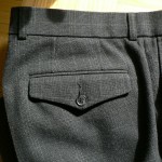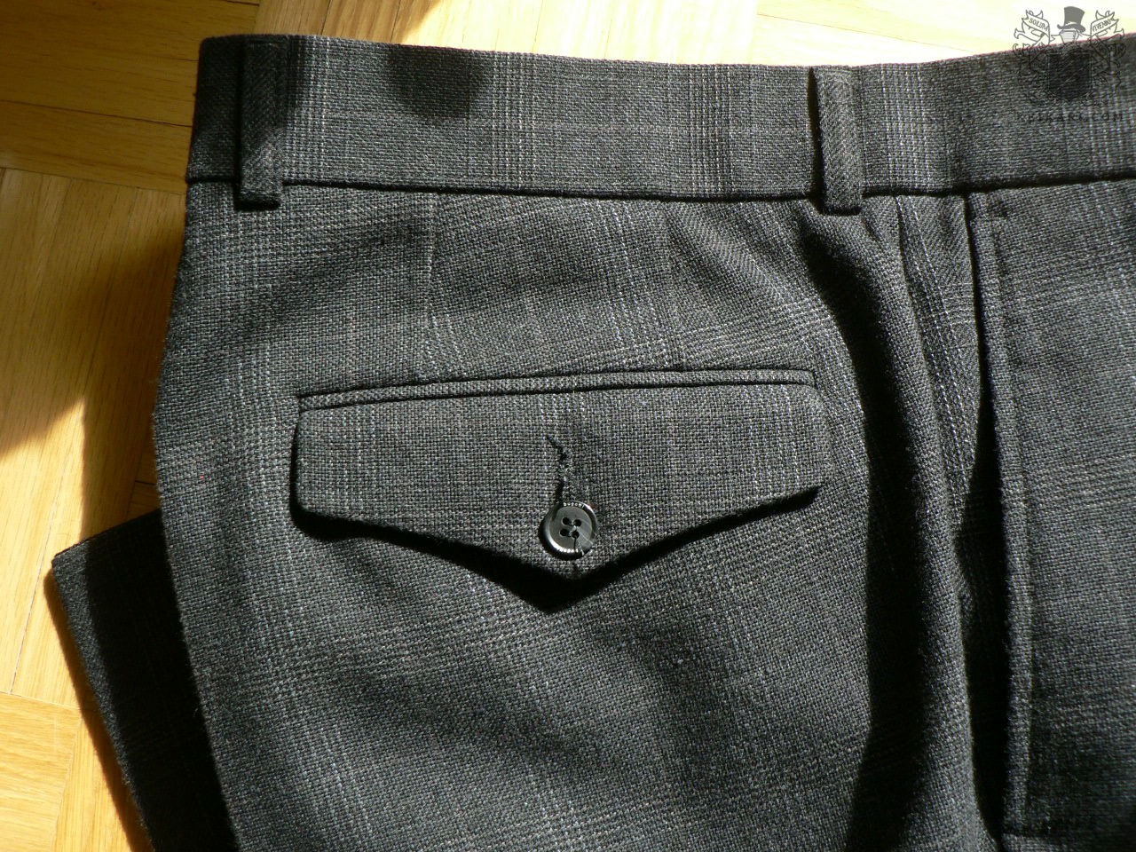 Puvuntakkiin tulee koristeelliset käsitikit (pick stiching), tummanlila vuori, kaksi povitaskua ja kaksi pienempää taskua. Armanin omana lisäyksenä tulee ns. nenäliinatasku. Hartiat ovat vain hitusen topatut englantilaista mallia seuraten, aavistuksen kohotettu käsien sauma (roped shoulder), kaksi takahalkiota ja mukavasti nipistetty lantio. Takin taskut ovat kahden kantin mallia, eikä niistä luoda toimivia. Takin kaulusten napinläpi on suora. Housut ovat vyötäröpituiset, yhdellä laskoksella leikatut, olkaimiin kiinnitetyt ja neljän sentin upslaakeilla varustetut. Housujen etu- ja takataskumalleista en pitkään ollut täysin varma, mutta ostettuani riittävästi housuja osui eteeni juuri hakemaani erilaisuutta. Etutaskumalli pysyy toistaiseksi epävarmana, takatasku sen sijaan toteutuu liittämäni kuvan kaltaiseksi. En ole koskaan ymmärtänyt, miksi housujen takataskuissa tulisi säilyttää yhtään mitään, joten projektin housujen takataskuista ei tule toimivia. Vetoketjua en housuihin halua, sen sijasta tulee neljän napin kiinnitys.