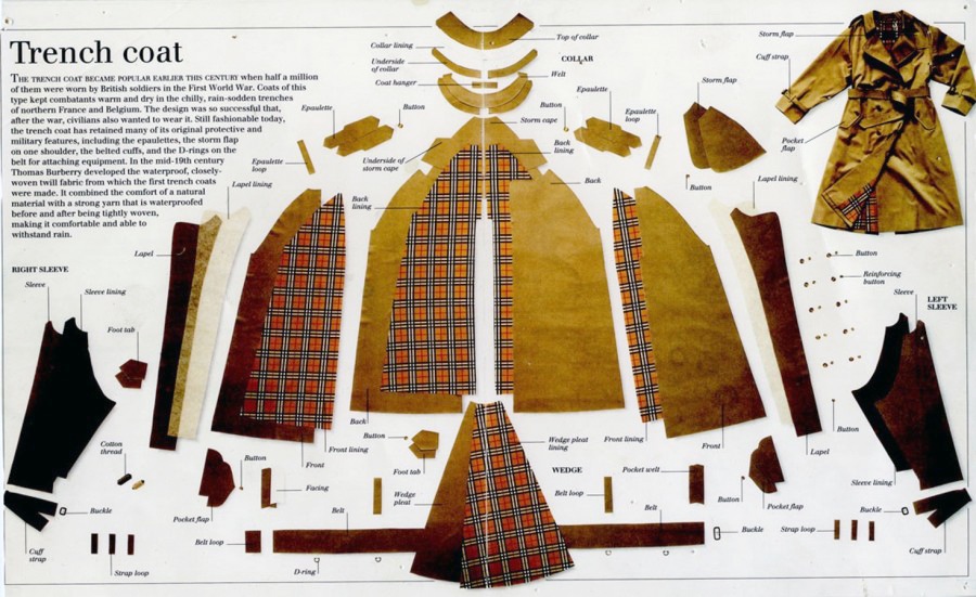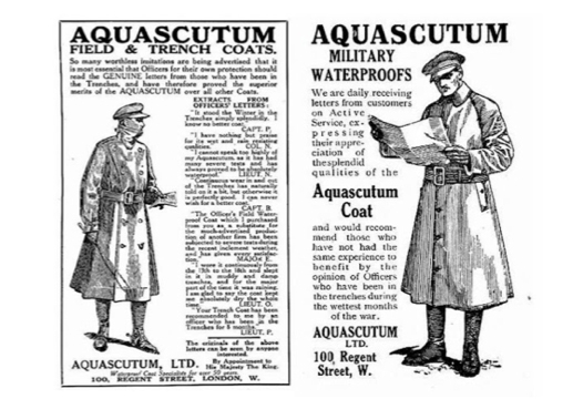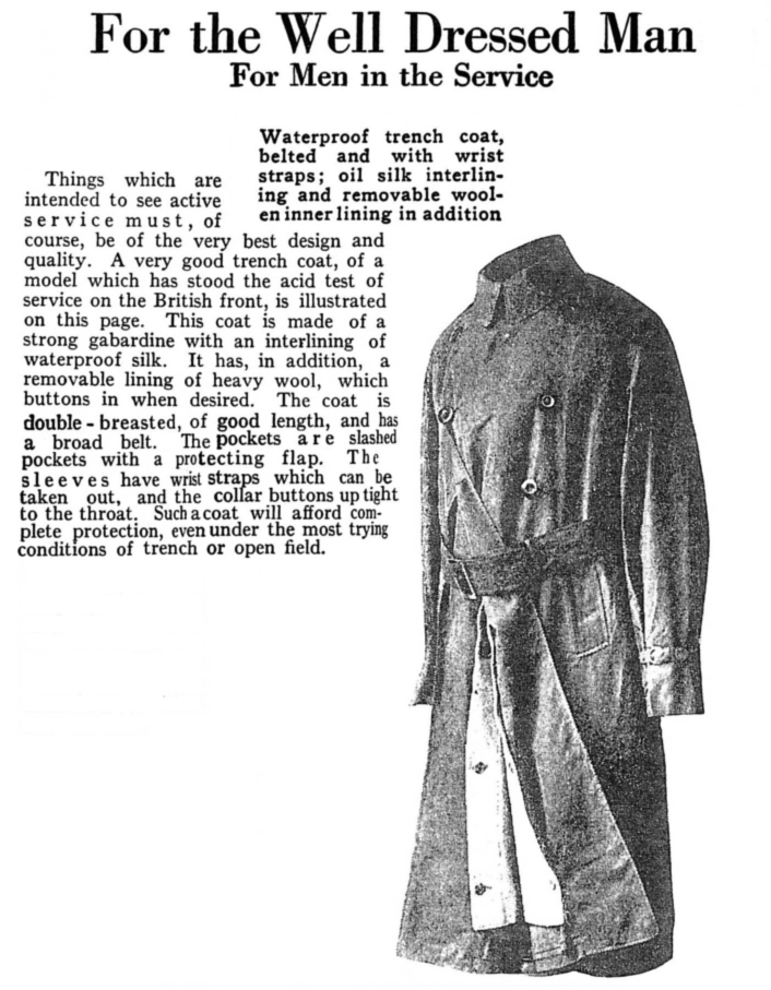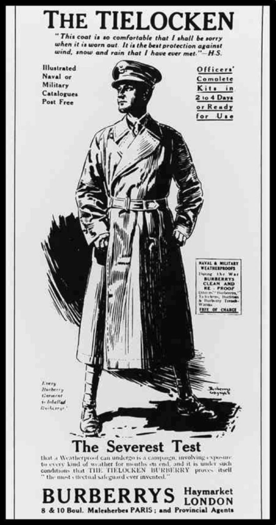 Silti molempien eteen kiilaa Mackintosh, jonka luonut Charles Macintosh toi markkinoilla nimeään kantavan Mac(k)intosh-mallisen sadetakin vuonna 1824. Sen materiaali oli puuvillaa, jonka välikerroksessa oli kumiliimaa, mutta mallissa ei ollut epoletteja ja se oli yksirivinen. Trenssiä siitä ei saa, mutta malli on taatusti innoittanut myöhempien aikojen takkimaakareita. Vuonna 1912 Burberry toi markkinoilla Tielocken-mallin, joka oli kaksirivinen, vaalea, gabardiinista valmistettu ja vyöllä suljettava. Siinä ei kuitenkaan ollut epoletteja eikä nappeja miehustassa, mutta malli oli trenssin selvä edeltäjä. Näiden vaiheiden perusteella uskon trenssin syntyneen Burberryn ja brittijoukkojen yhteistyönä, jonka lopputulos yhdisti sotilaiden palautteen, sotavaatteiden vaatimukset ja vaatehtetaan tietotaidon. Sodissa erinomaiseksi havaittu takki ilmestyi katukuvaan rauhan myötä ja se on säilyttänyt olemuksensa sadan vuoden ajan.