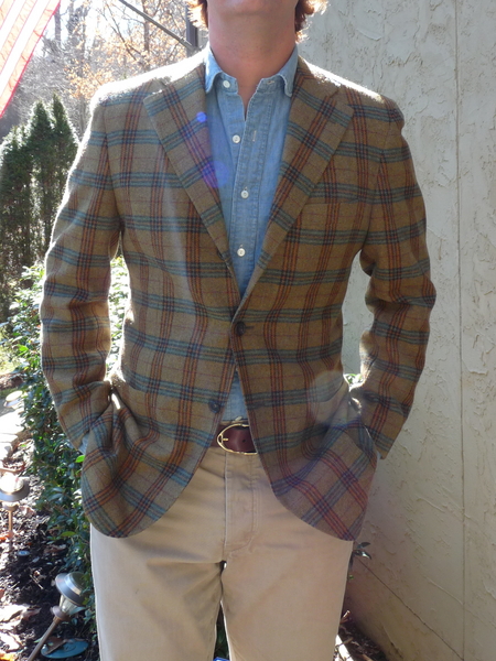Pieni kokoonpano, joka osoittaa miten tukkijätkä ja metsänomistaja voivat kohdata samassa tyylissä: rohkearuudukkoinen, karhea tweed-takki, denim-kauluspaita, paksumpi ruskea vyö, vaaleat puuvillahousut ja –kenties juuri tässä tyylissä sopiva — puuttuva taskuliina.