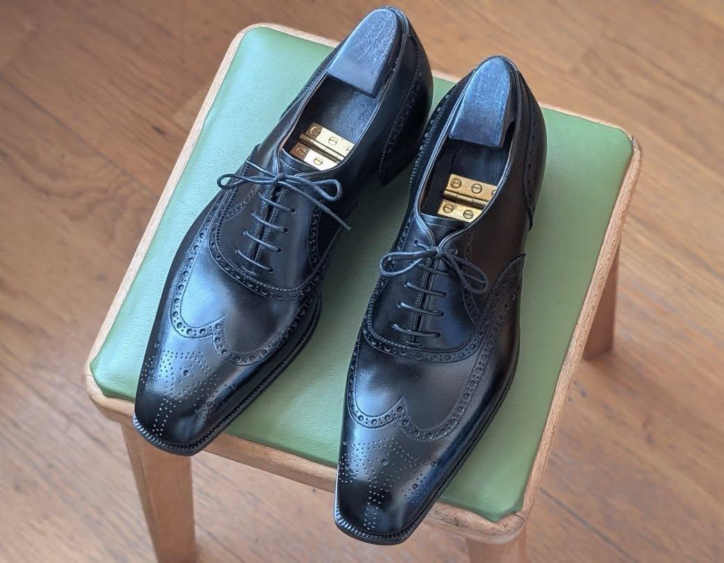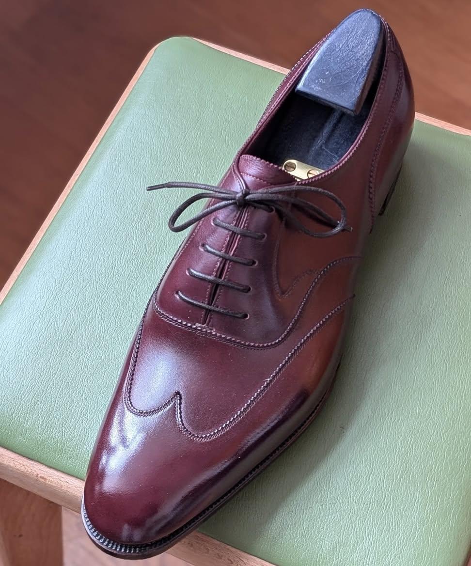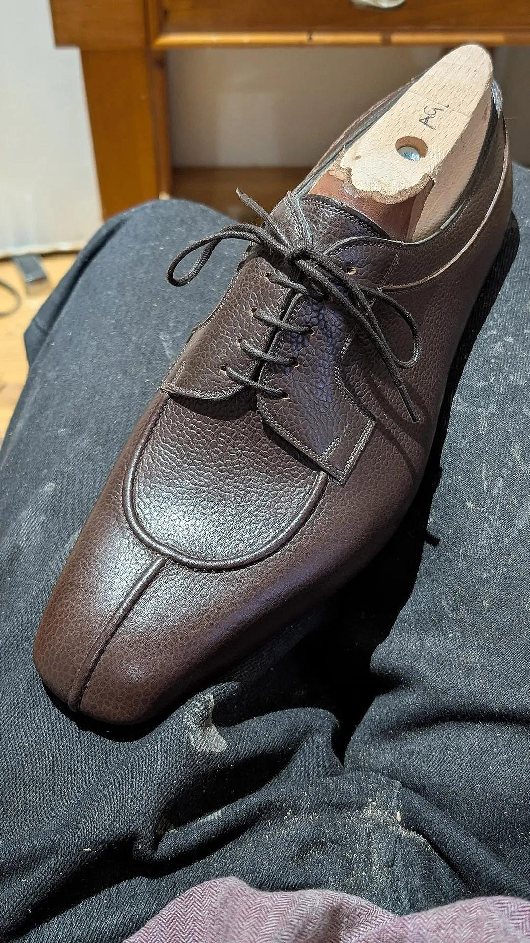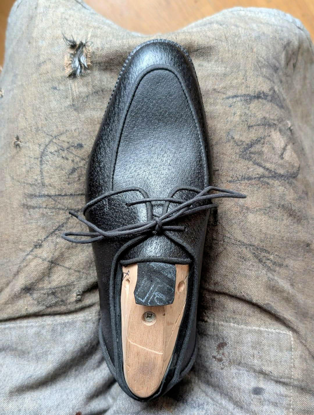 MT: I’m married to Laura, who was actually my very first client when I started exploring shoemaking. The first pair I made for her was a dark burgundy side-lace Oxford, which was a well-loved style at the time. She’s always been very supportive and has a great eye for design: some of her suggestions, like a black pigskin two-tie derby with grosgrain, have ended up being quite popular among my clients!