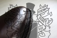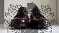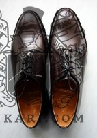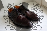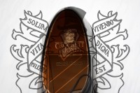 As an example of C&J’s make is the plaintoe derby model Ashdown in shell cordovan leather, made on last 341, with double leather soles. The cordovan uppers, often titled crup in England, are lasted carefully with no creases or bubbling in sight. Stitching is straight and tight in a suitably matching shade of thread. The derby edges are piped with black leather, which offers a welcome contrast to the otherwise eggplant-like pair.The heels are rigid and rounded, the toe chiseled and slightly pointed, all with proper stiffeners to maintain shape and guarantee support.