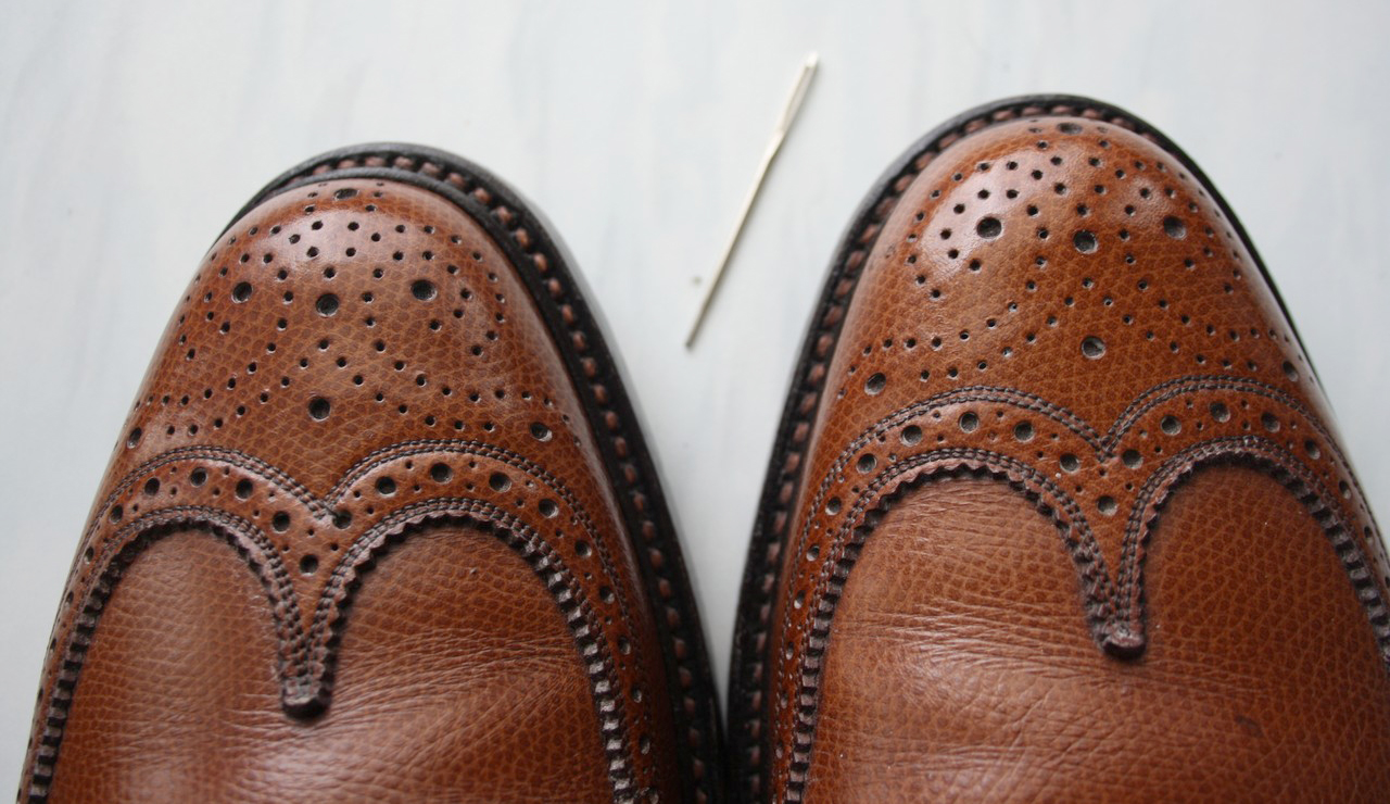 Any great brogue pair is a wonder and a pain. Pleasant for the feet, joy for the eyes — and yet, a troublesome pain to clean. After applying cream or polish, the said gunk will inevitably get stuck in the many little holes on the pair. An oft-repeated tip is to choose a toothpick for cleaning brogue perforations and medallions, but each passing year these picks will mount up and end up wasted. What I propose instead is a thick steel needle. This helpful tool will clean and reach even the smallest of holes, but remain in service for as long as its kept in proper place.