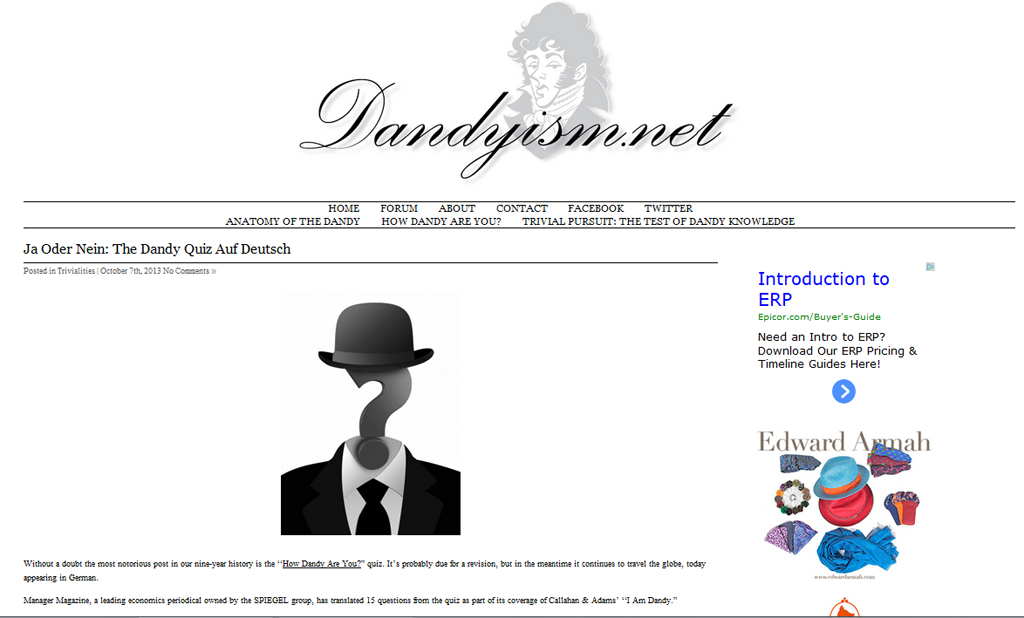 Dandyism.net is back. The site took a virtual grand tour (or hiatus from creditors) while its creator delved deep into traditional, natural-shouldered American dress over at Ivy-Style. Very true to its name, Dandyism.net spreads the wonders of dandyism for the man who cares. English social dandyism and French literary dandyism shake hands as the site’s main men, known as The Junta, unearth lesser-known dandies, turn their biabolical monocle on books on the topic, pass judgement on the forum or share articles and reading tips for the eager student.
