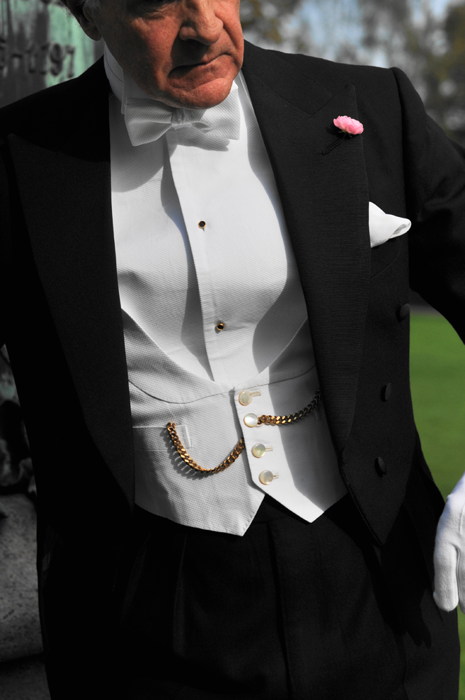 My dress suit is worn with the white waistcoat not showing under the dress coat front, as specified by the Prince of Wales and subsequently Fred Astaire. Another pet peeve of mine is that it seems nowadays the waistcoat for lounge suits is often too short, not covering the top of the trousers properly (and often showing a belt buckle, oh dear!) I use gauntlet cuffs of various designs a lot, SB and DB – an old family tradition due to its military background. My buttonholes are not only working for traditional reasons; when I do close-up magic I often roll my sleeves up, to prevent any: “Ahh, it vent up the sleeve” -accusations! Thus I’m probably the only bespoke customer with an actual reason for these.