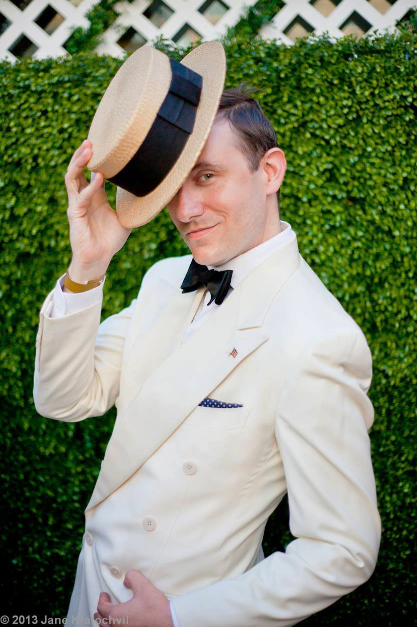 1. Vintage boater and double-breasted cream dinner jacket. American flag pin for Fourth of July. Photo: Jane Kratochvil.