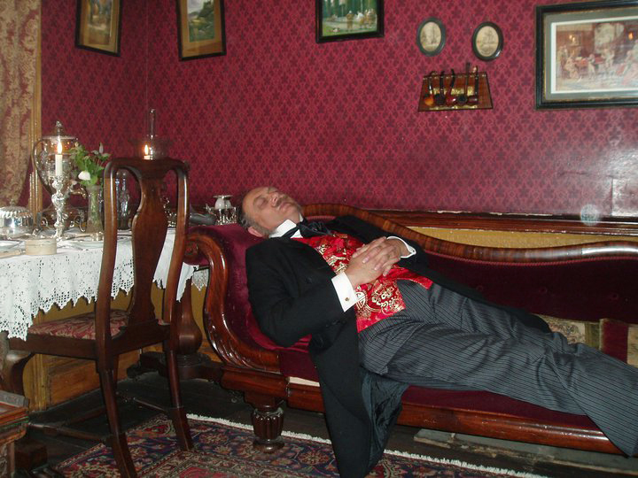 But the bottom line is: I don’t stick to any rigid doctrine (or get too obsessive about “historical accuracy”), I just wear what I feel like wearing on any given day — at least I have enough frock coats to be able to wear them often and with quasi-casual wear underneath. You also have to think of climate and comfort, so the chances of me wearing a high, stiff collar when the sun is belting down is somewhat slim. It depends on the event I am going to. I do have a lot of jackets and blazers, so it’s not all frock coats and striped trousers. Often I might wear my morning coats with striped trousers!