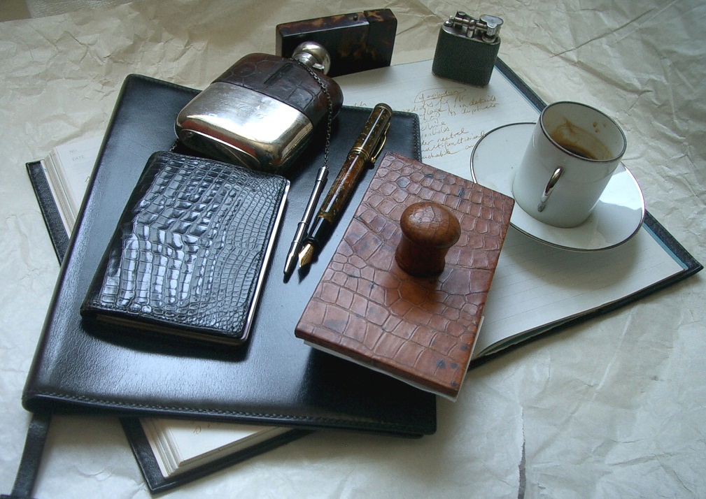 I don’t subscribe to that horrible marketing statement that my possessions are an extension of me. But I like things that have a bit of meaning to me, or that make me think or at least smile. I don’t really collect any particular type of item. I suppose I just like interesting things, whether it’s an old but still usable alligator-wrapped flask, a vide-poches from an 18th-century tobacconists’, or my silly orange fountain pen whose model name was “The Dandy” and an old Asprey alligator blotter to mop up its ink [pictured above]. I don’t have space to collect many of any particular kind of item. I do like nice cufflinks but in recent years have reduced rather than expanded my number of those.
