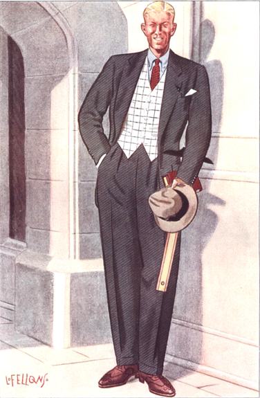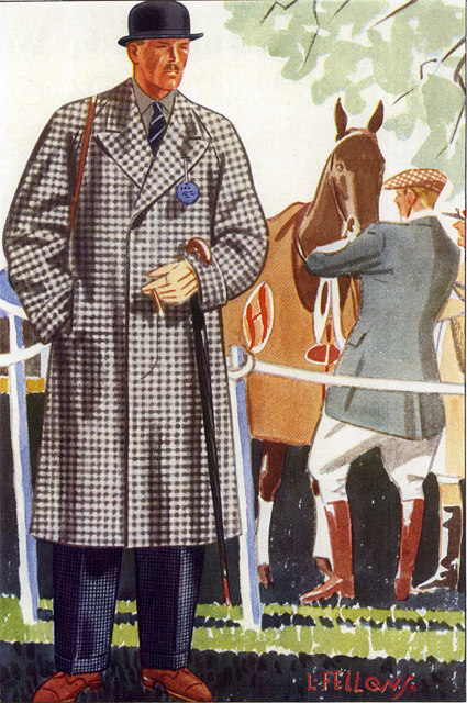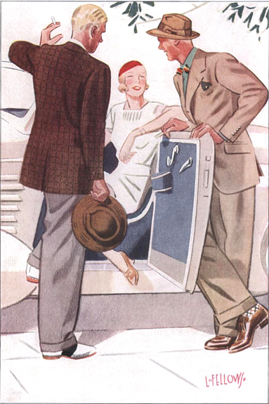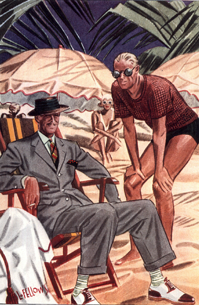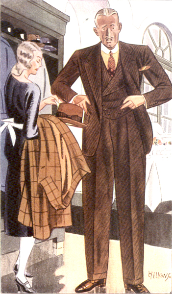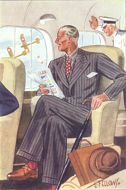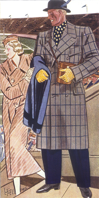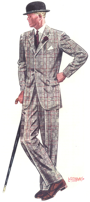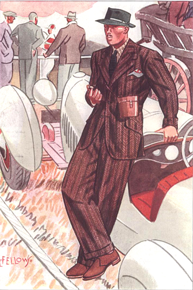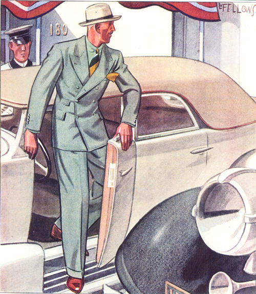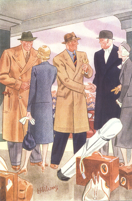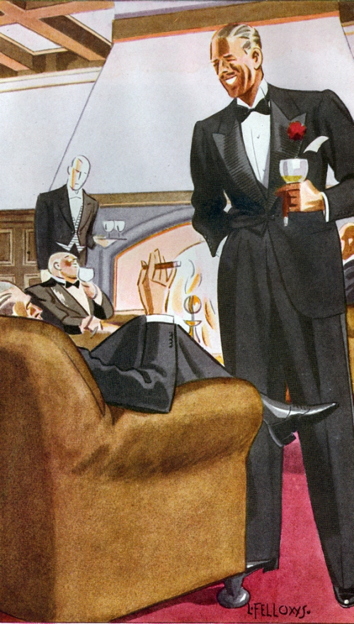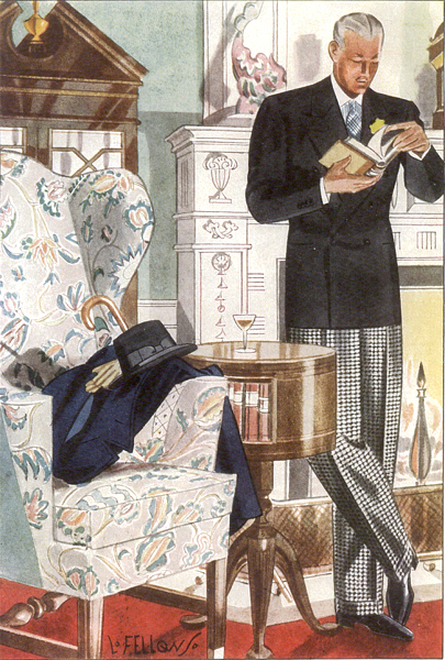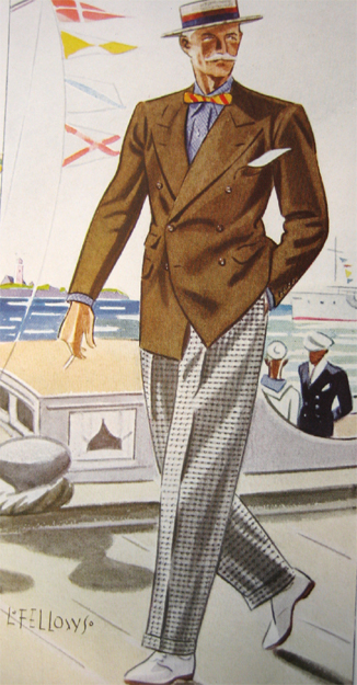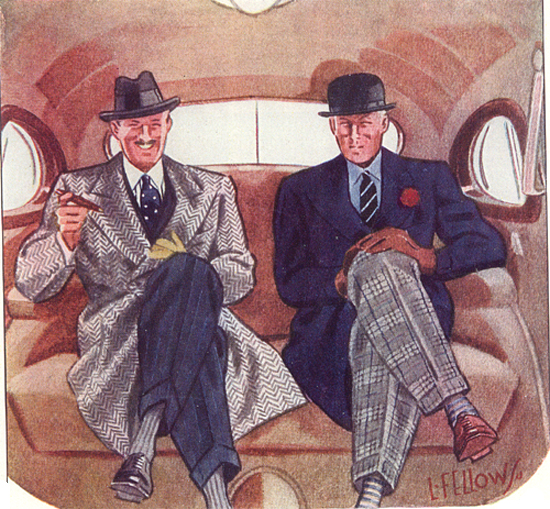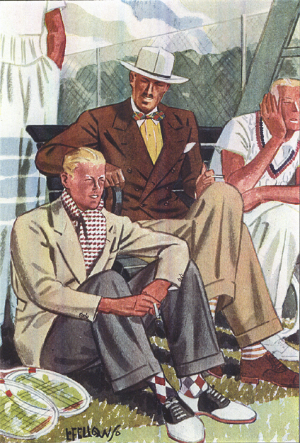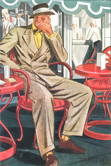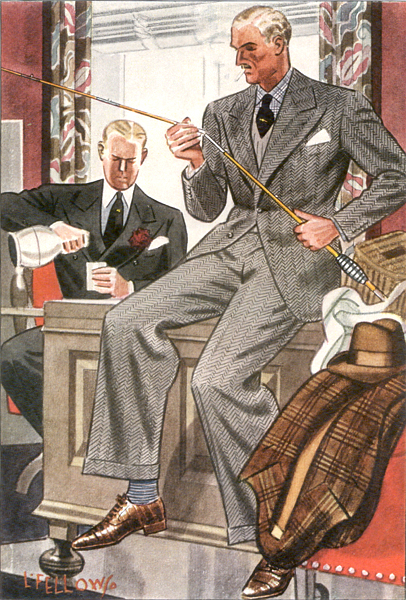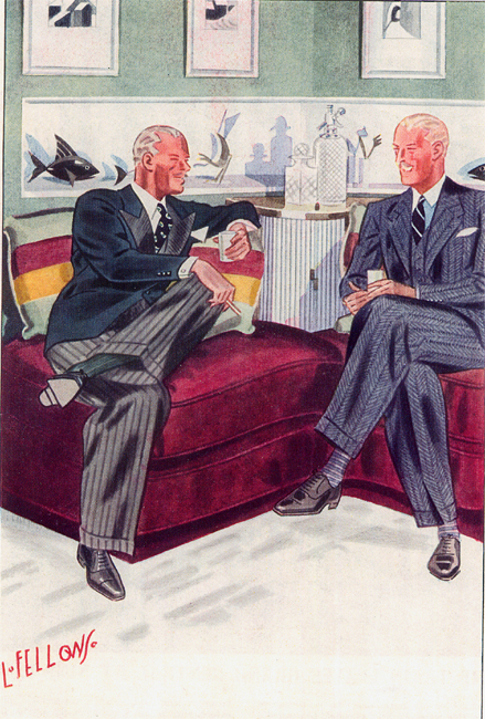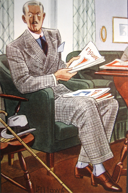 Those in the know have no problems identifying the unique style of one L. Fellows. For inspiration and admiration I have collected a small number of menswear illustrations from the pen of this renowned artist. I’ve added publishing years to photo captions when available. If clicking through all these 94 prints is cumbersome, I have uploaded the whole selection in a Winrar file on another site. Pictured below in the black’n’white photo is Fellows himself (upper row, right) in the company of fellow illustrators. Many more Fellows illustrations can be found on The London Lounge forum online, though approving new members sometimes takes a very long time.