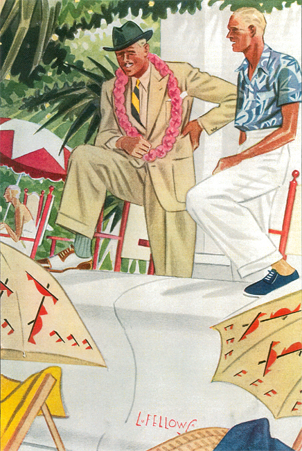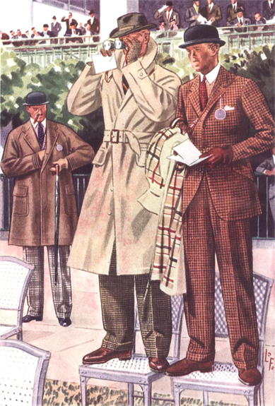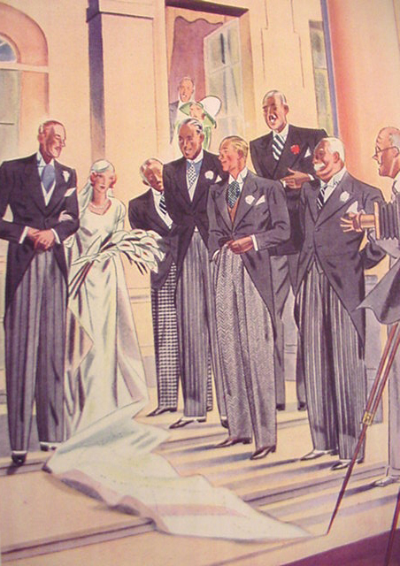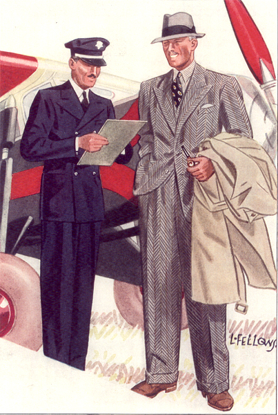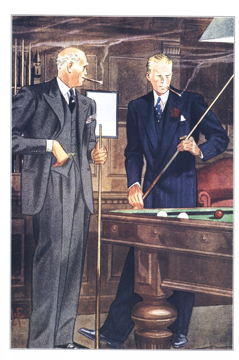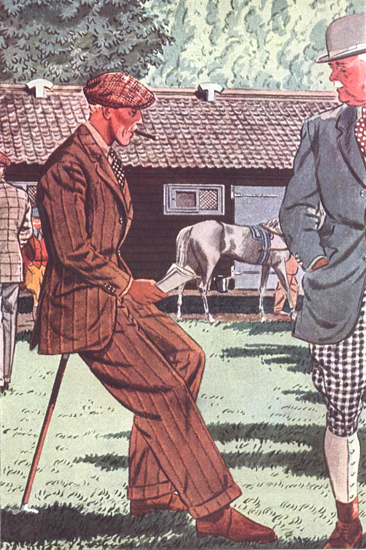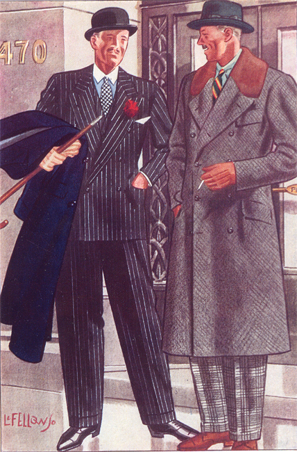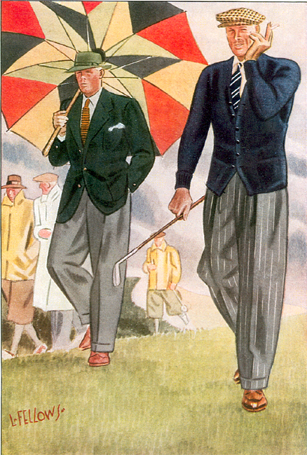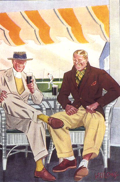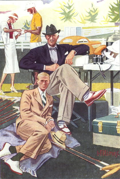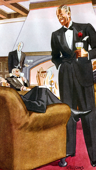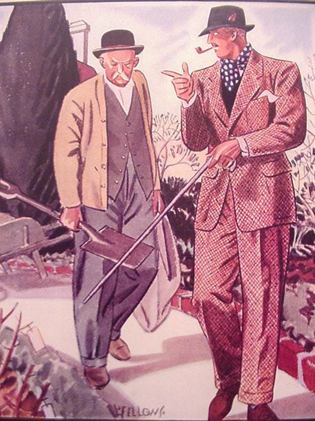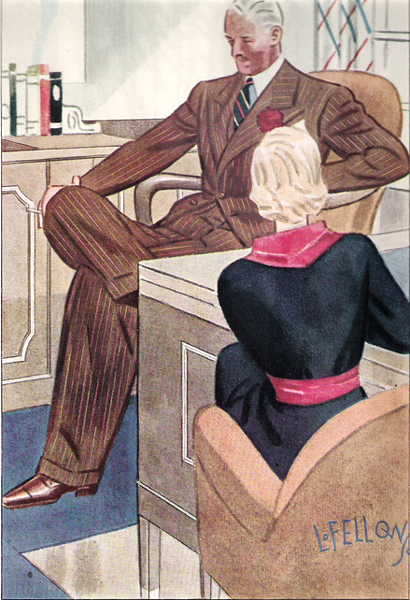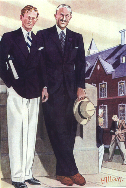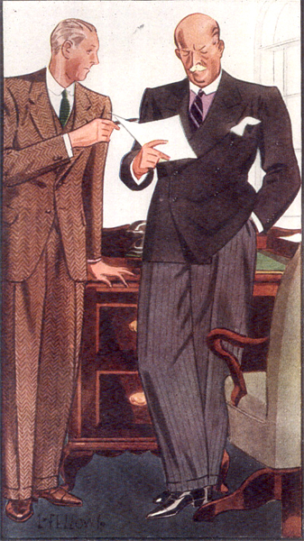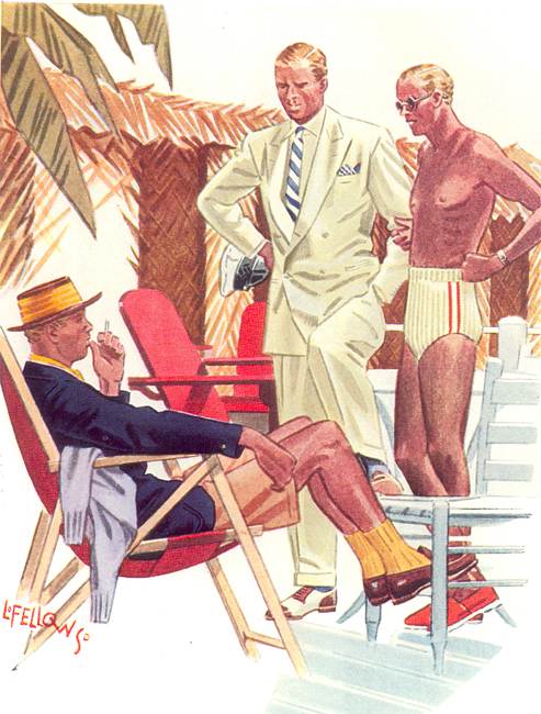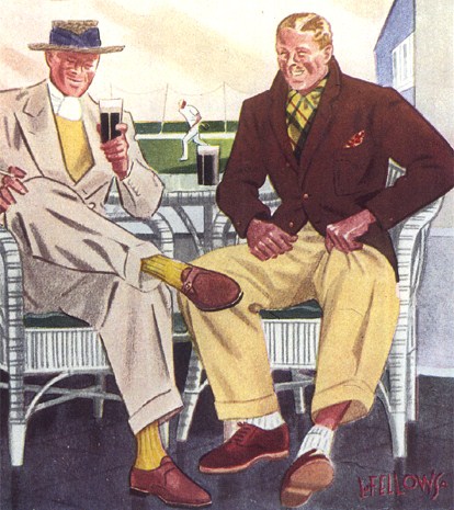 Those in the know have no problems identifying the unique style of one L. Fellows. For inspiration and admiration I have collected a small number of menswear illustrations from the pen of this renowned artist. I’ve added publishing years to photo captions when available. If clicking through all these 94 prints is cumbersome, I have uploaded the whole selection in a Winrar file on another site. Pictured below in the black’n’white photo is Fellows himself (upper row, right) in the company of fellow illustrators. Many more Fellows illustrations can be found on The London Lounge forum online, though approving new members sometimes takes a very long time.