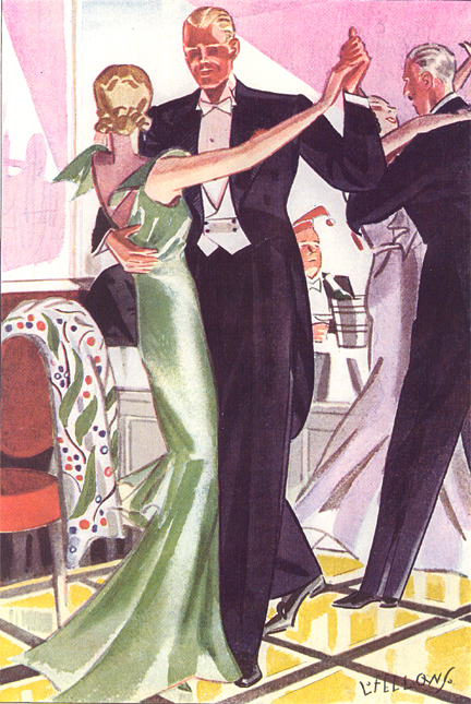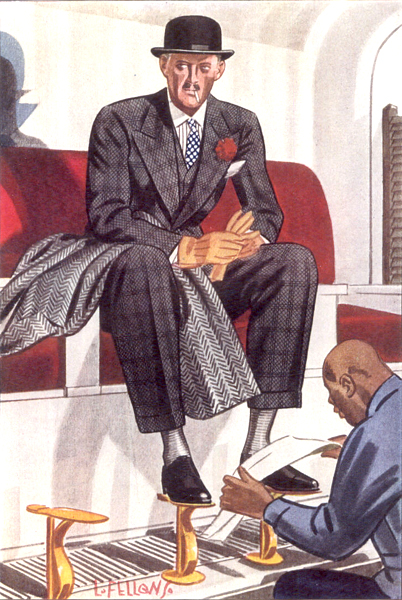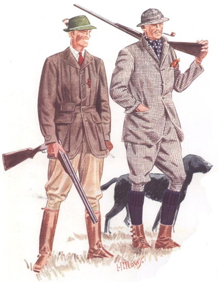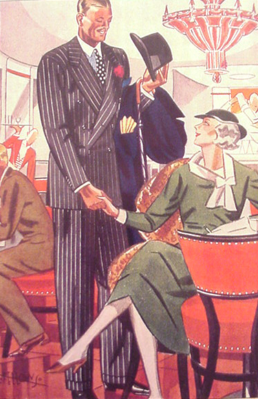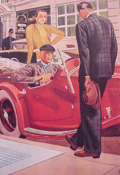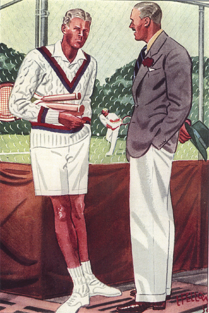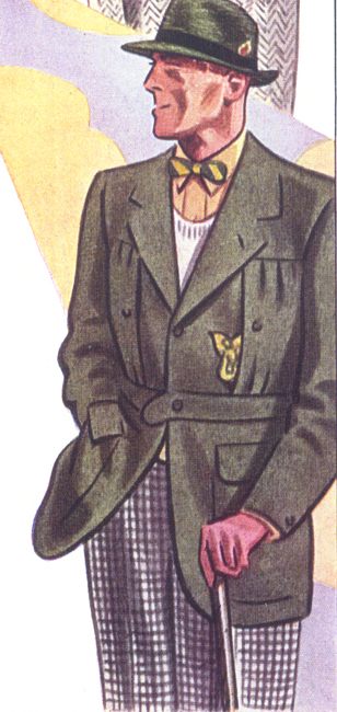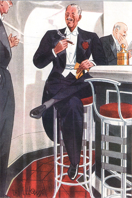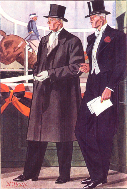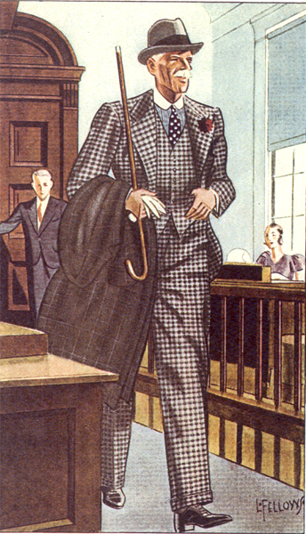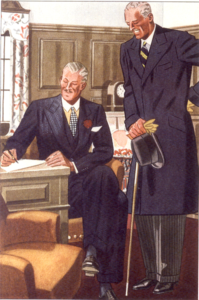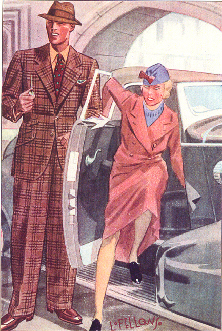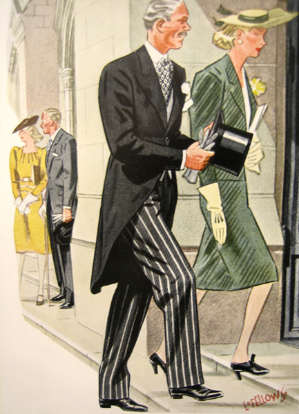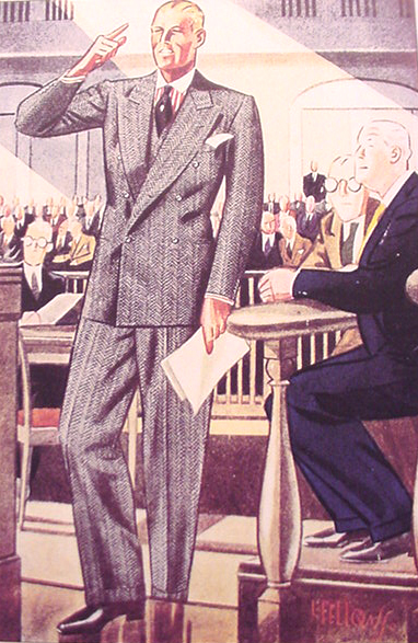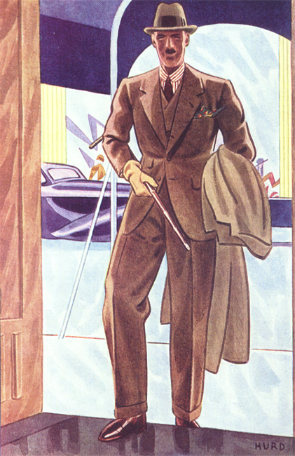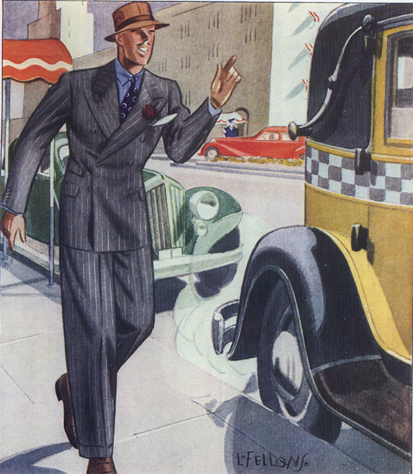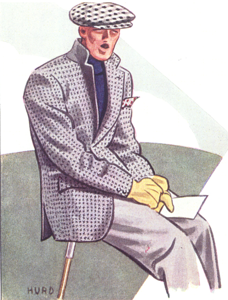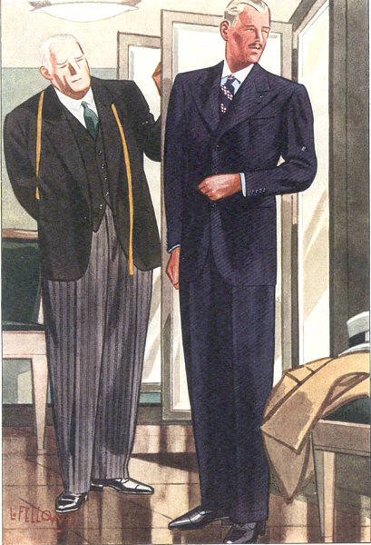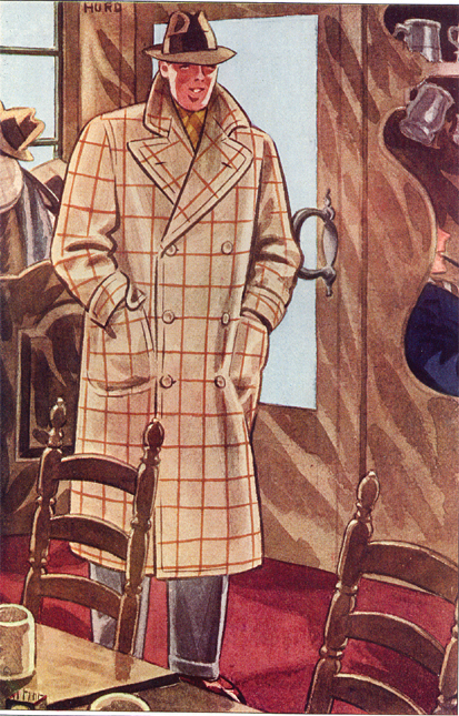 Those in the know have no problems identifying the unique style of one L. Fellows. For inspiration and admiration I have collected a small number of menswear illustrations from the pen of this renowned artist. I’ve added publishing years to photo captions when available. If clicking through all these 94 prints is cumbersome, I have uploaded the whole selection in a Winrar file on another site. Pictured below in the black’n’white photo is Fellows himself (upper row, right) in the company of fellow illustrators. Many more Fellows illustrations can be found on The London Lounge forum online, though approving new members sometimes takes a very long time.