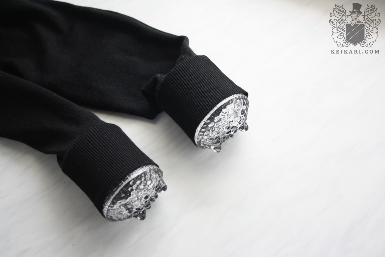 Most woollen knits have plenty of stretch in the ribbing, but ecxeptions abound. When the piece fits well, but its sleeve ribbing squeezes, it’s time for a little trick. The ribbing should be doused and the sleeve filled with a cylindrical item. Anything with a round shape will do, just as long as it’s large enough to stretch the sleeve. I favour glasses. Wet wool will change permanently with the help on consistant stretching, ribbings included. After the moisture has dissipated, the filling is removed and the sleeve should now fit. The only caveat for such operations is the filling size: too large ones will stretch the sleeve excessively, too small ones have no effect.