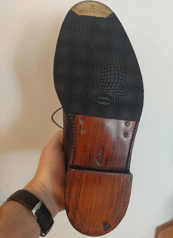 Kesällä ostamani Florsheimin tykkiveneet olivat tänään käyttöönottokävelyllä, saatuaan sitä ennen puolipohjat ja kärkiraudat alleen. Ihmettelen kyllä itsekseni miksen samalla ottanut myös kantaan kumipohjaa. Tuo kannan v-cleat saattaa vielä joskus koitua liukastukseksi, vaikka se onkin hieman upotettu tuonne kantaa, joten ei sentään tule saksalaisen upseerin kävelykilkettä kivilattialla.