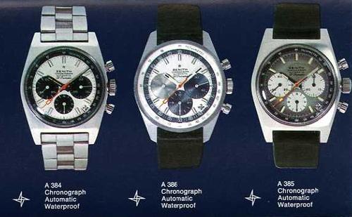 Tässä kuva Zenithin vanhasta esitteestä, jossa A384-5-6 trio on koko komeudessaan. Tästä triosta El Primeroiden tarina alkoi vuonna 1969.