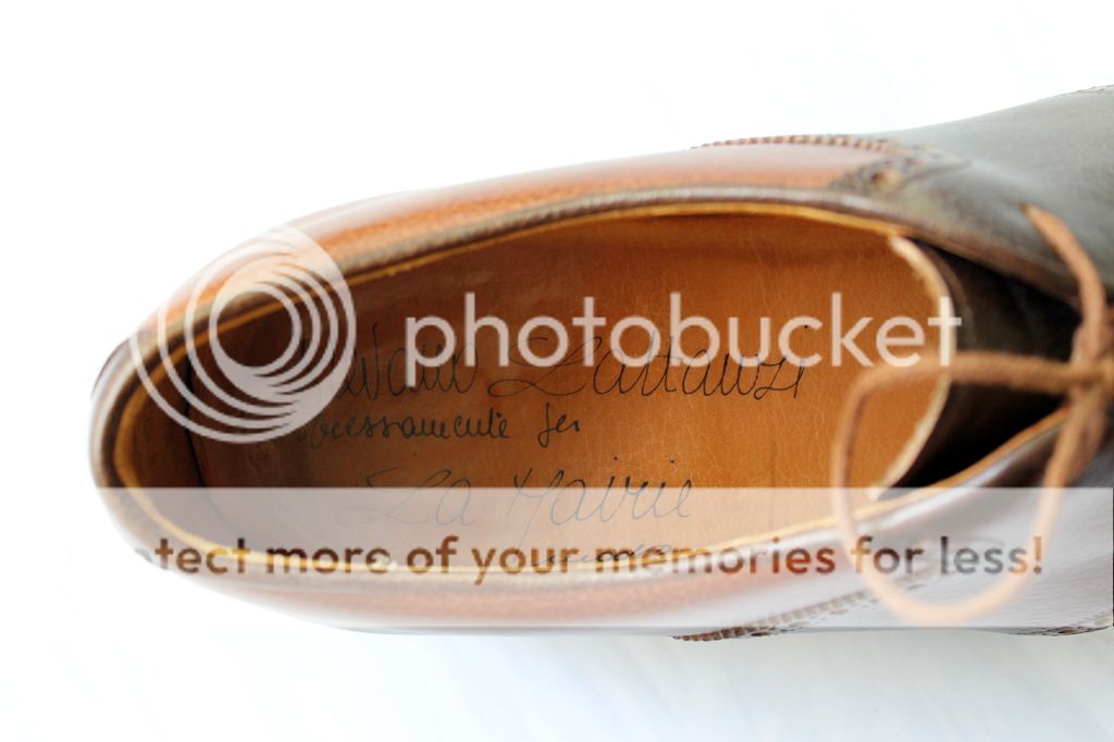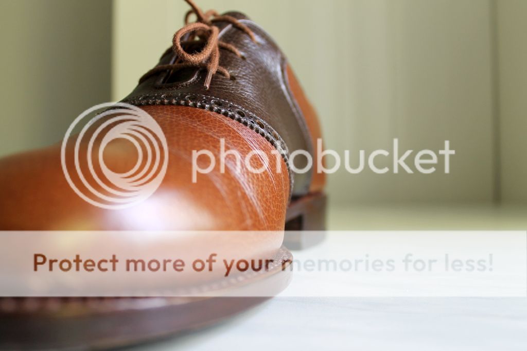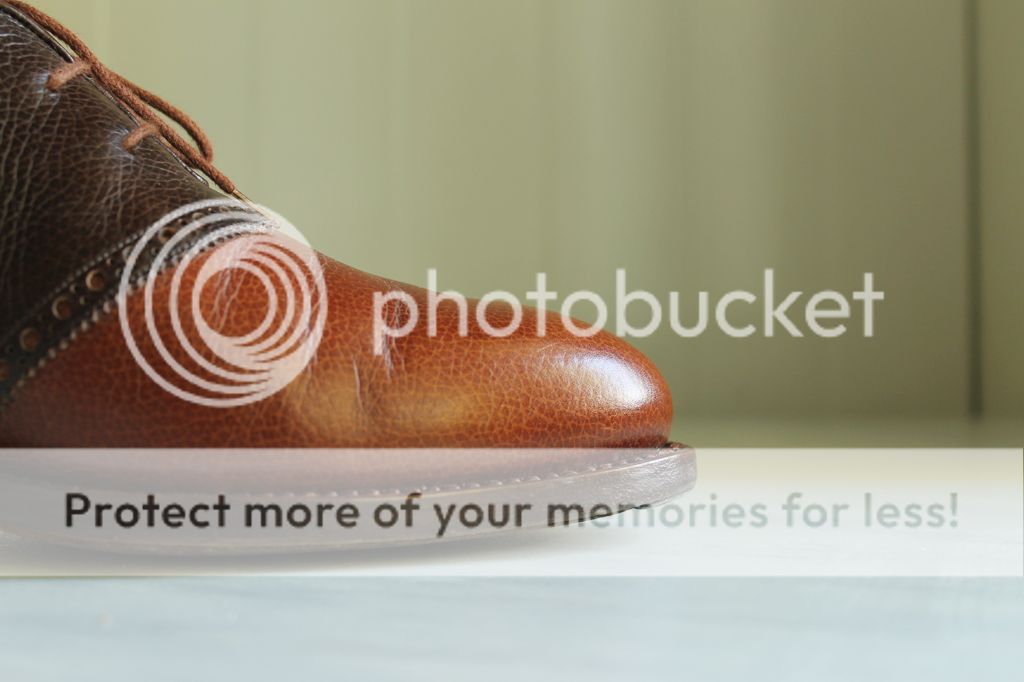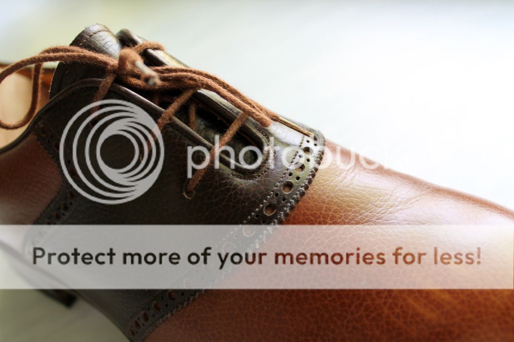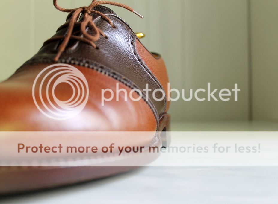 Viimeisin lisäys Lattanzi-kokoelmaani: satulakengät martioidusta (puhvelin?) nahkasta, pyöreä kärki, kolme nauhareikää, tylsänpullea lesti, nahkapohjat. Golf-jalkineet, joista pohjapiikit on poistettu. Inspiroiduin Tommin satulakengistä, jotka vakuuttivat. Tämä pari kyllä nakersi valmistajan tasoa silmissäni -- päällinen on venytetty lestille joko kiirellä tai voimalla, jonka vuoksi sekä kärjykseen että reunoksen yläpuolelle on jäänyt ilkeä repeämä. Näin ei pitäisi käydä minkään myyntiin asti päätyvän jalkineen kohdalla, vihoviimeisenä Lattanzin hinnoissa pyörivän pareissa. Joku mokasi pahasti.